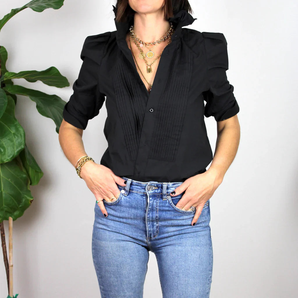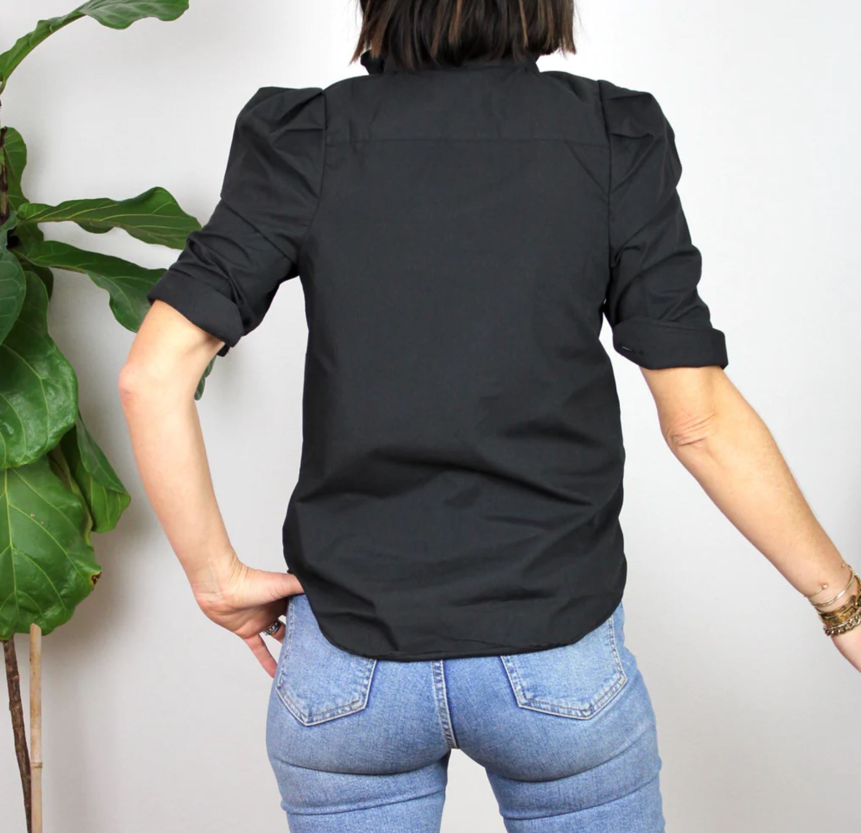 Our beloved puff sleeve style with ruffle collar! 3/4 sleeve button down with stand up collar including a Ruffle!