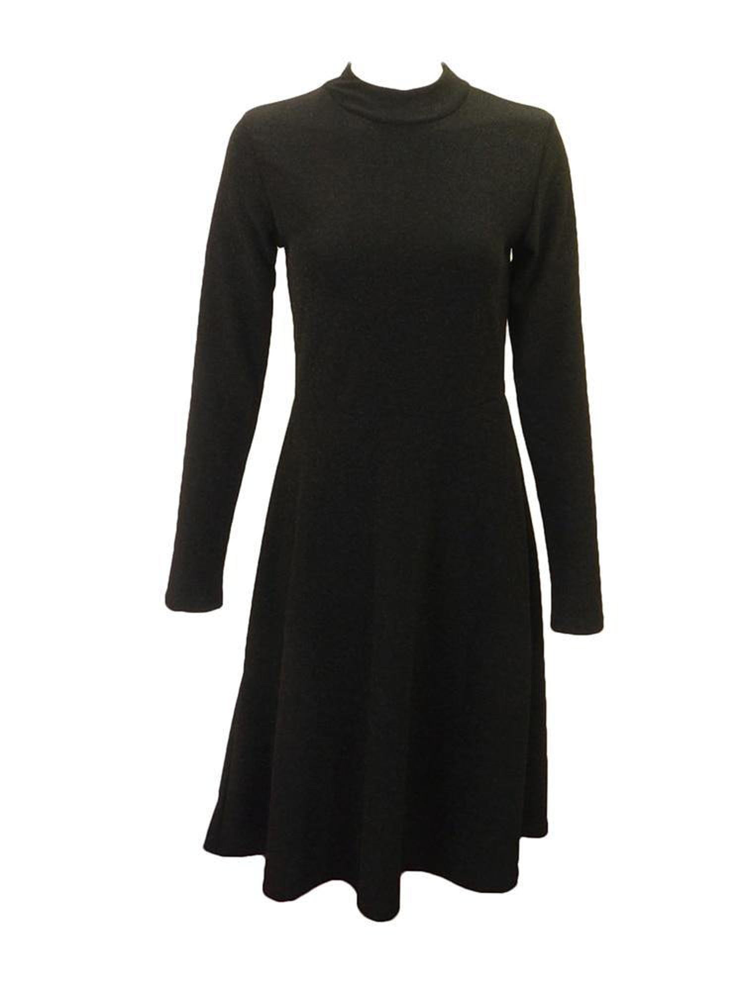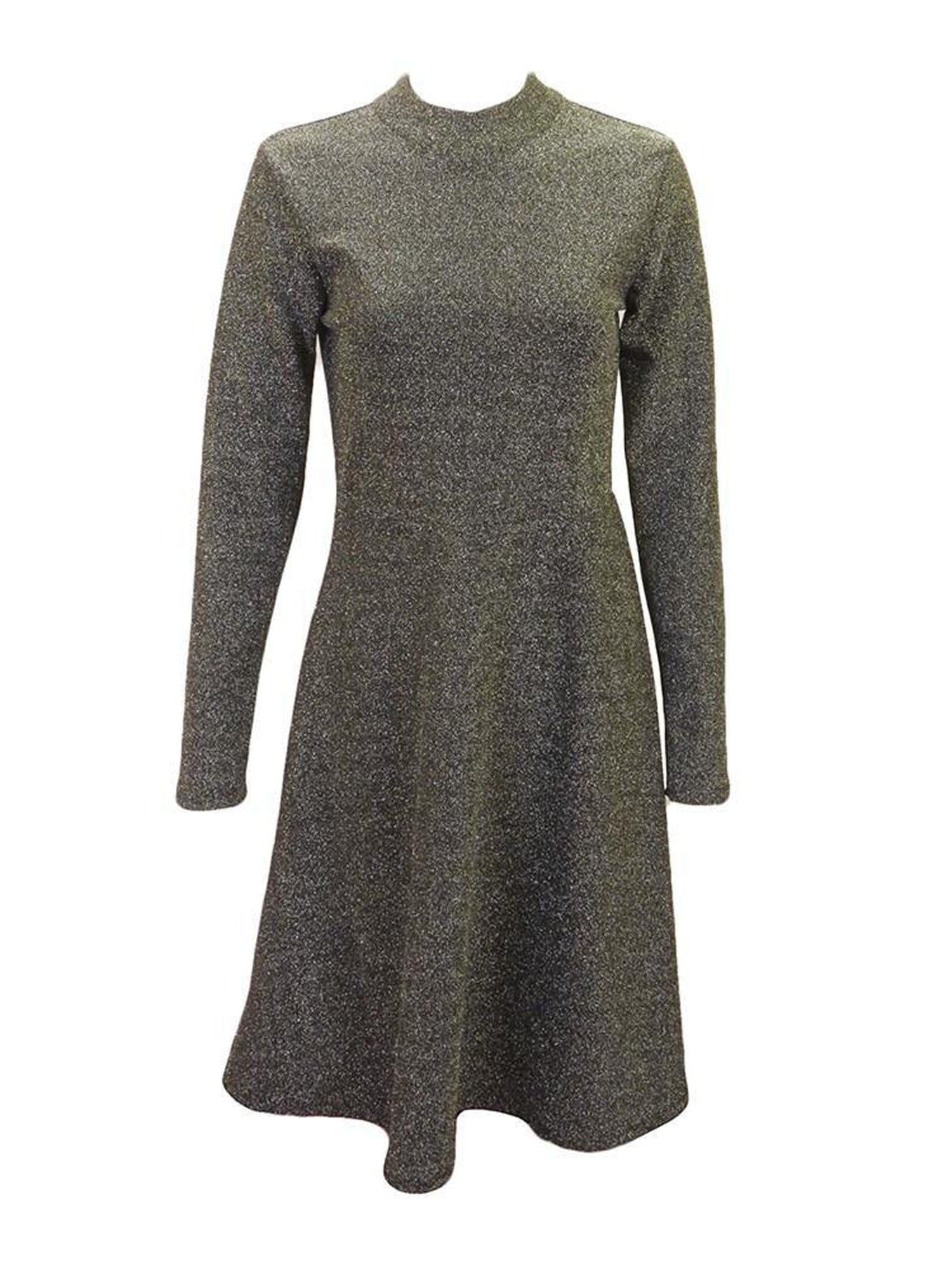 Long sleeve lurex knit mock turtleneck a-line dress. Knee length, invisible zipper in back. Machine washable, 95% Polyester, 5% Spandex.