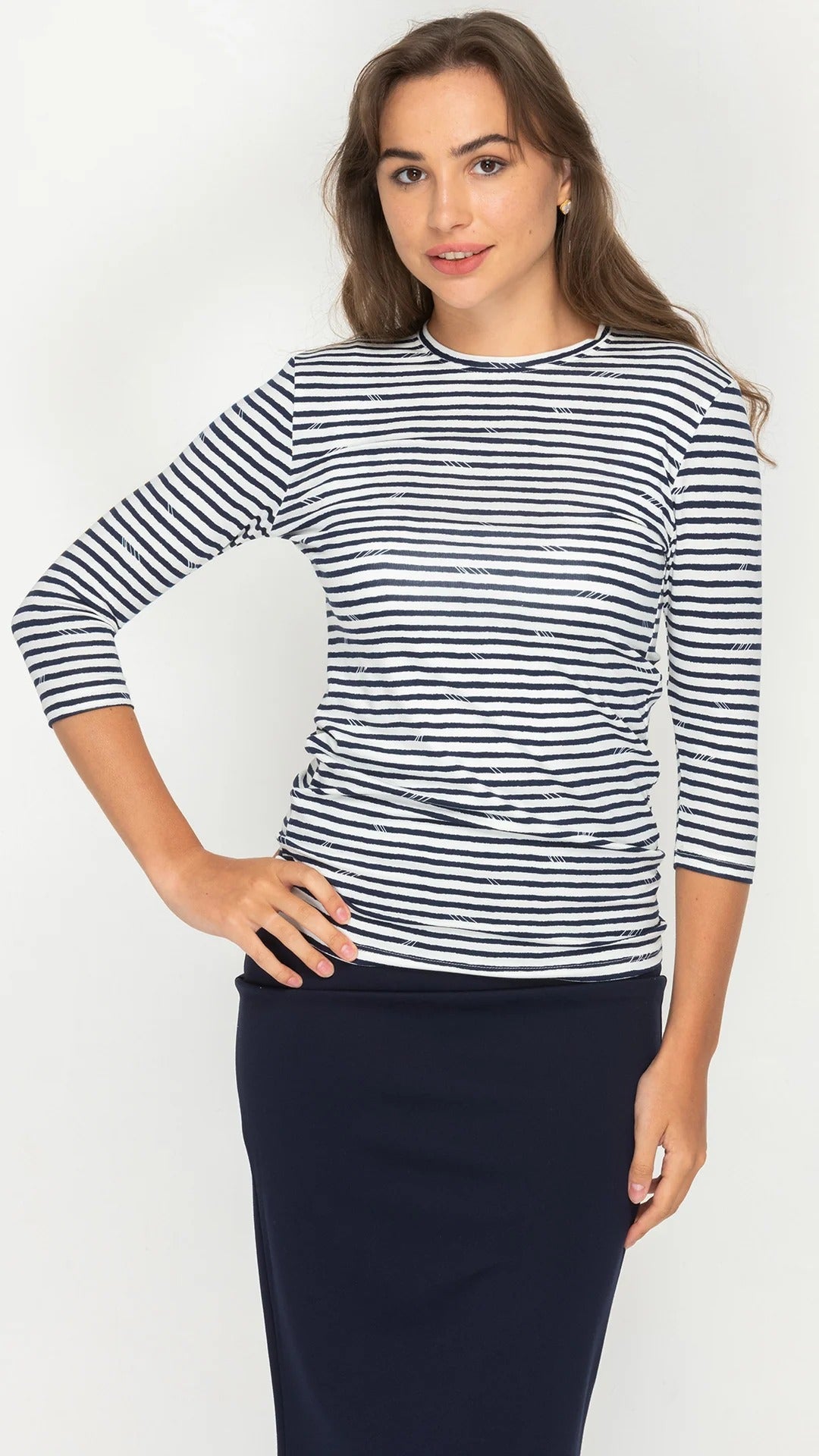 The Basic T-Shirt Top is the perfect combination of comfort and style. Made with bamboo jersey, this 3/4 sleeve tee shirt is lightweight and soft. The 95% Rayon and 5% Spandex blend makes it easy to care for, as it can be machine washed and laid flat to dry. Order one size up for a looser fit. KMW