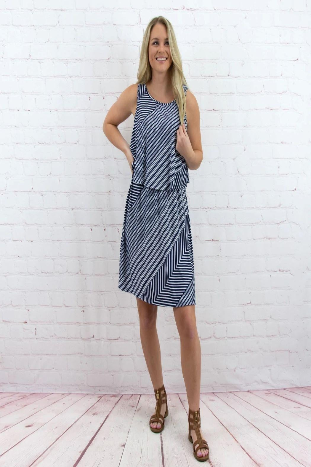 This knee-length popover dress is the perfect summer dress! It has a fun smocked waistline with a flowy skirt. The chest on this dress is also lined so it is not see through. You could easily throw a cardigan or jean jacket over top of it as well for an extra layer.