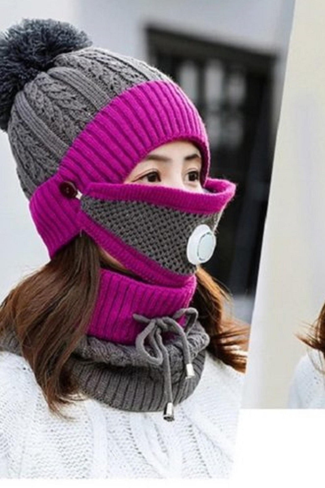Knit Pom Pom Beanie + Neck Scarf + Mask combo