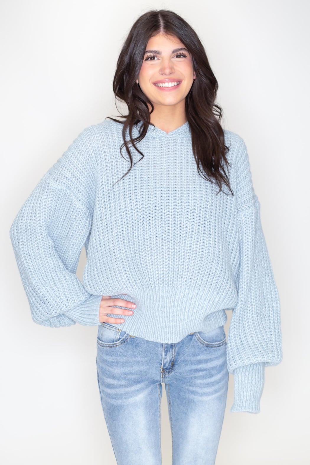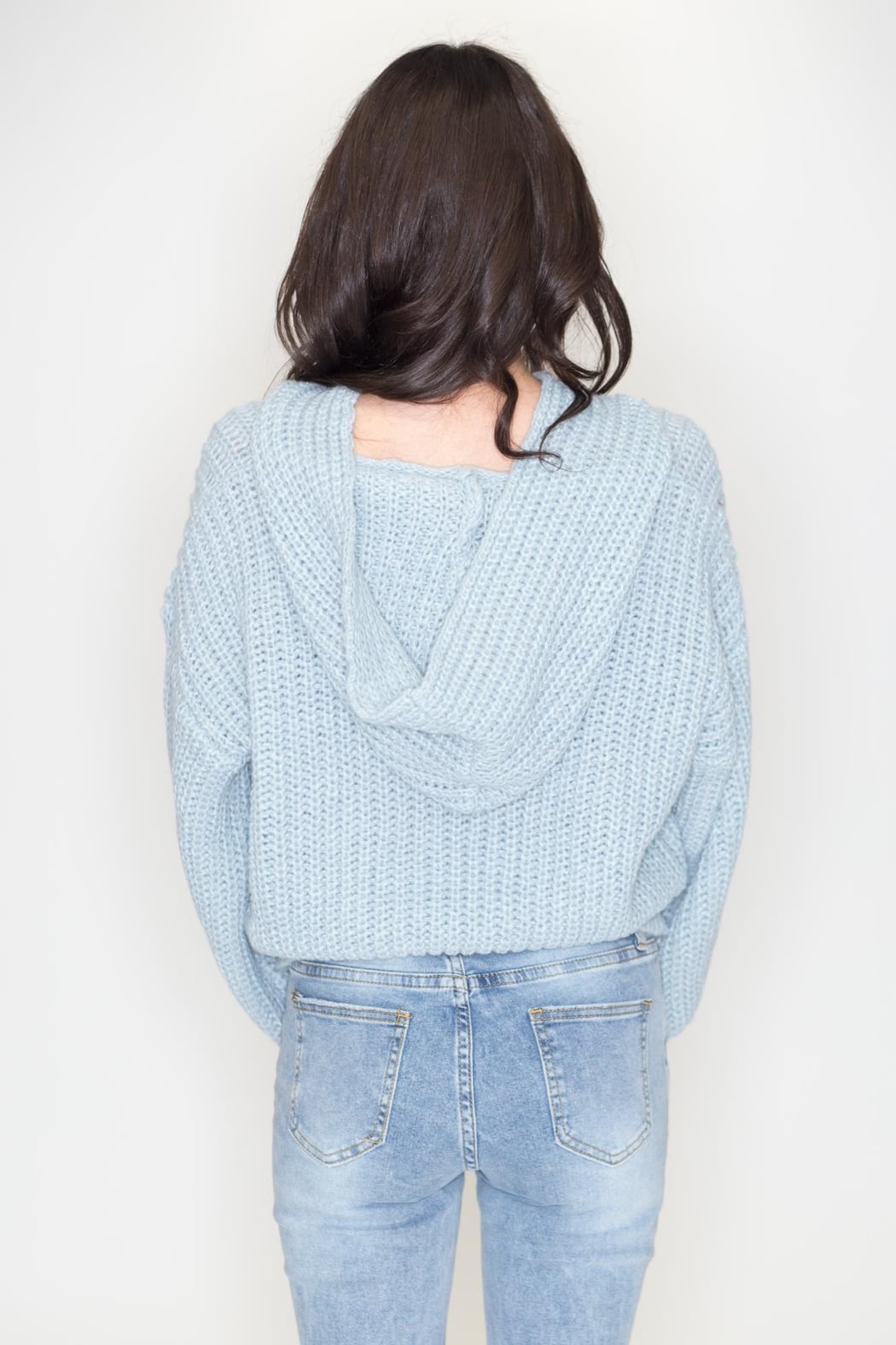 Ice blue cable knit hoodie sweater.