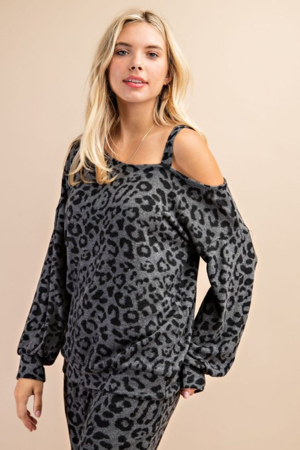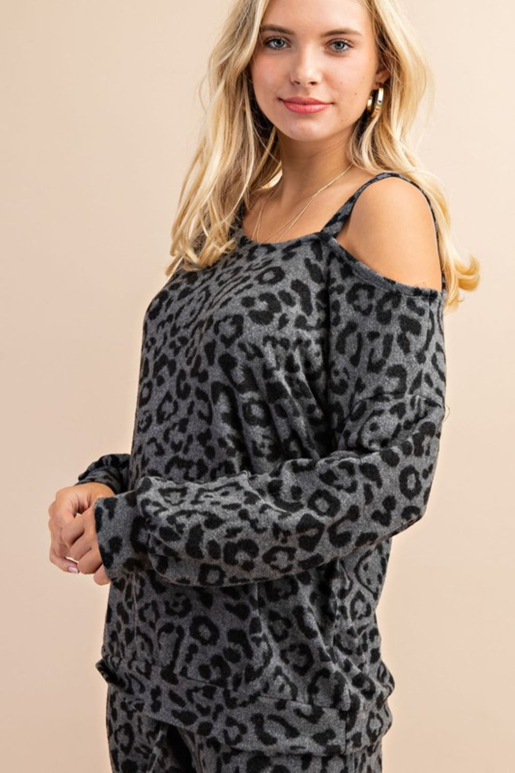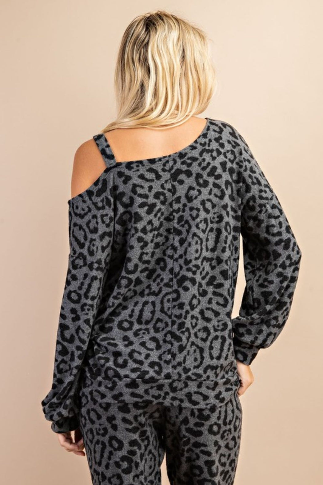 This knit leopard print sweater features one cold shoulder detail and a rounded neckline. Looks great with joggers or jeans.