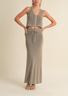 The Knit Maxi Skirt offers both style and comfort. Made with soft and premium knit quality, it features a waist string for a customizable fit. Elevate your wardrobe with this versatile and must-have piece.