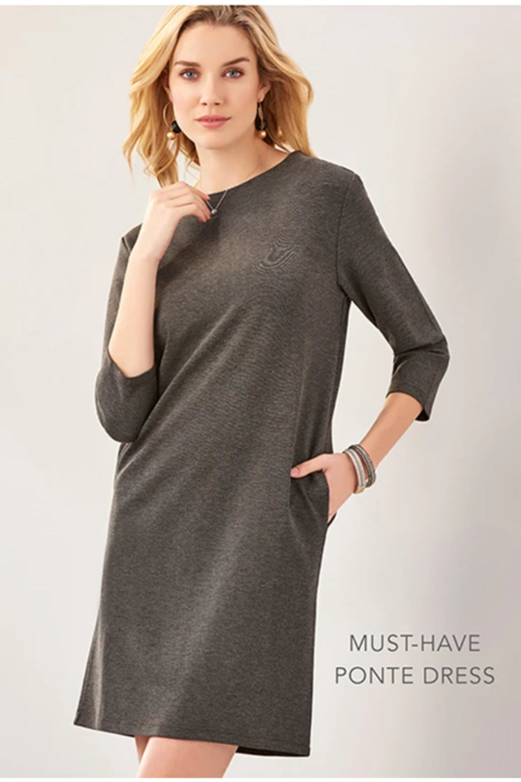 Never wonder what to wear to work with this classic shift dress designed with front pockets, a back seam, three-quarter length sleeves and a crew neckline.