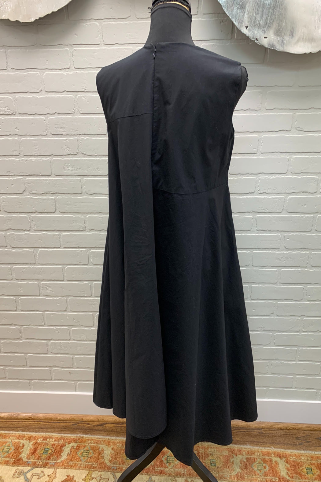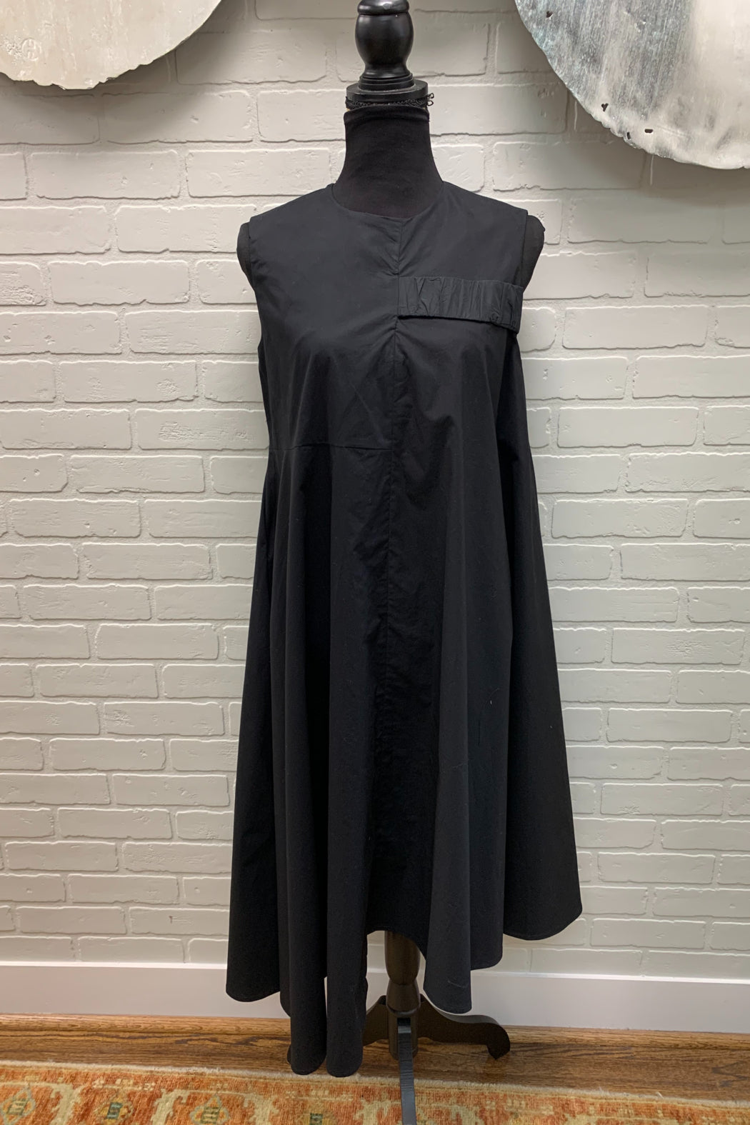 Sleeveless dress with zip back and round neck. Assymetrical hem. Covered elastic detail on front. Side hidden pockets.