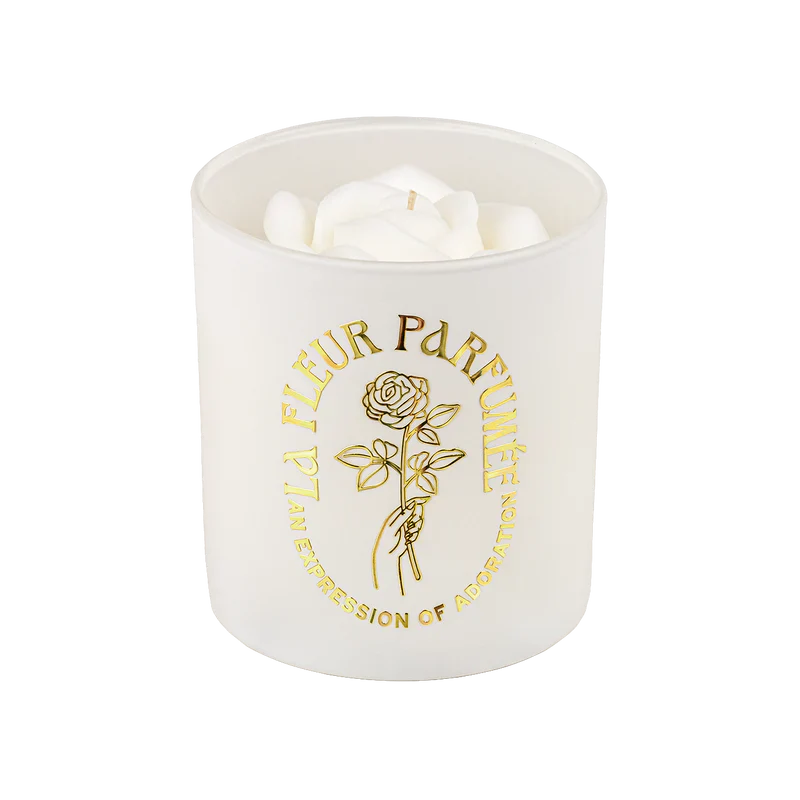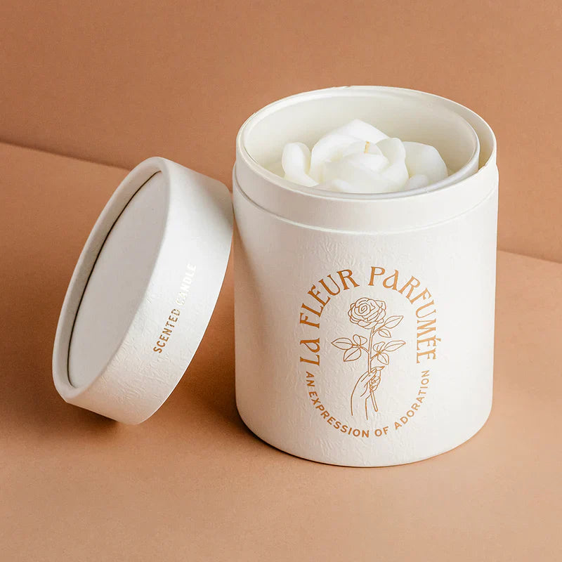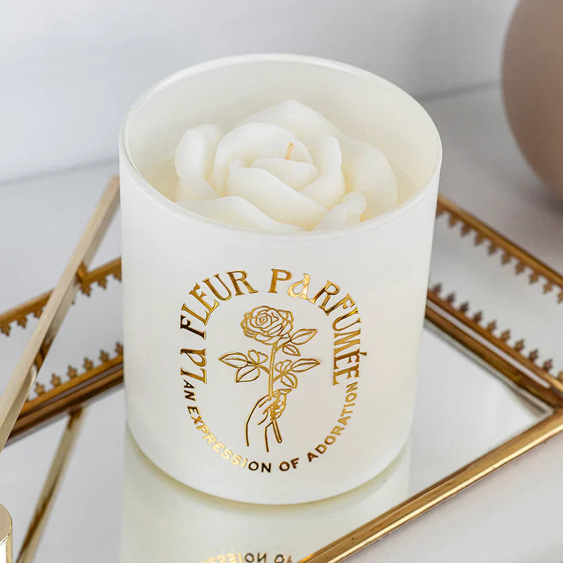 La Fleur Parfumée - An Expression of Adoration™. A luxury scented soy candle, with elegant sculpted wax rose detail. Natural soy wax, fragranced with essential oils. Blended and poured by hand in the USA. Non toxic, cruelty free and vegan.Packaged in a premium, hand made gift box.