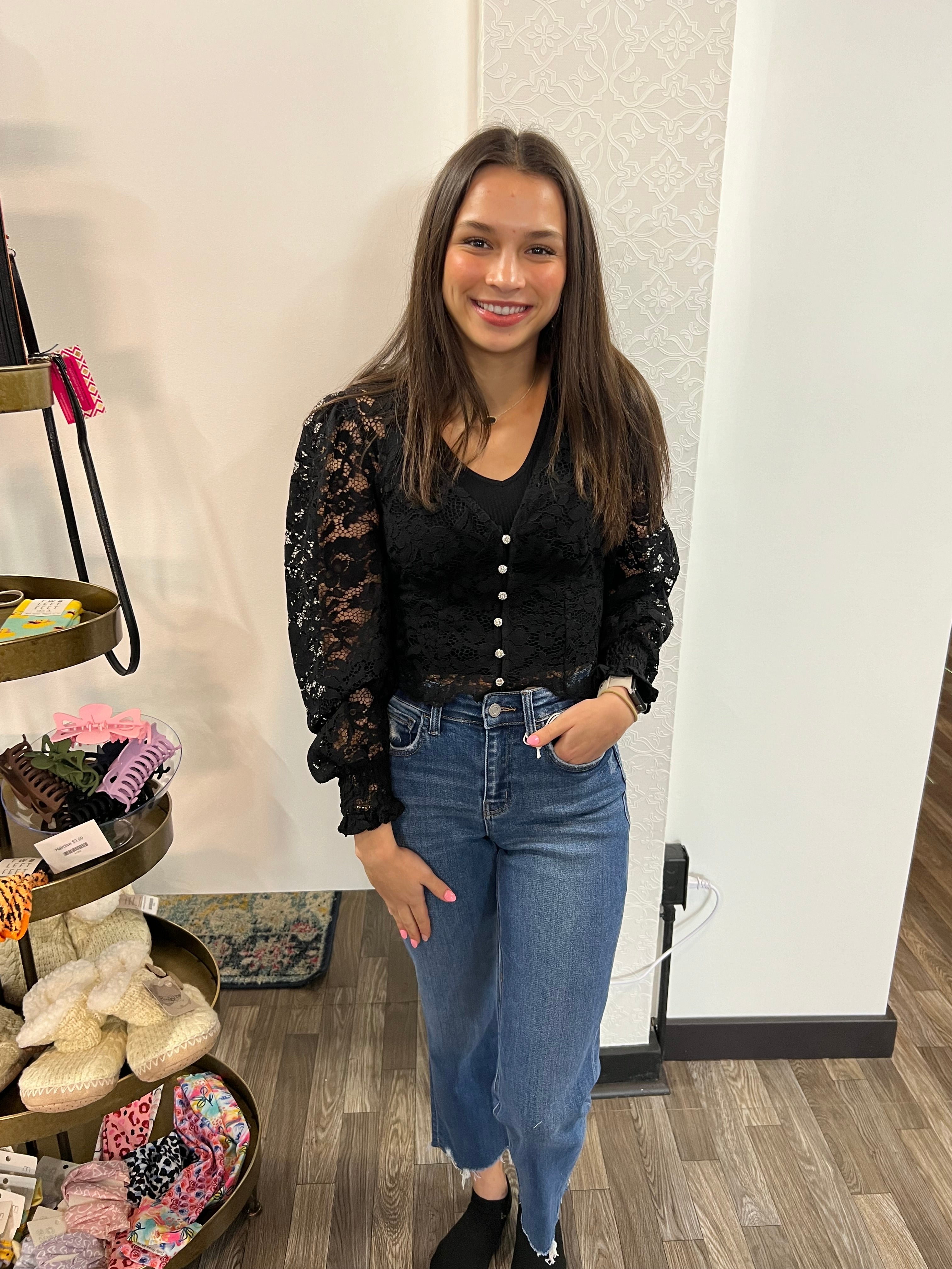 Experience ultimate style and comfort with our Lace Button Down Long Sleeve Crop Top - a must-have addition to your wardrobe! Pair this with your favorite cami for the perfect Valentine's Day or Date Night look!