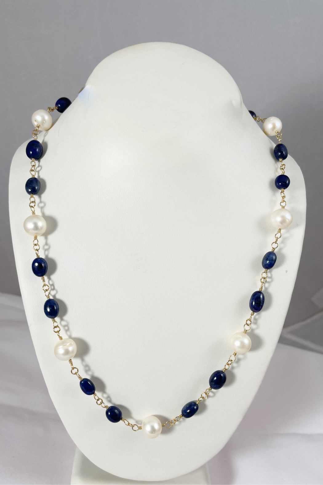 Single strand of Lapis and Pearls. Wire wrapped with gold-fill and a lobster clasp.