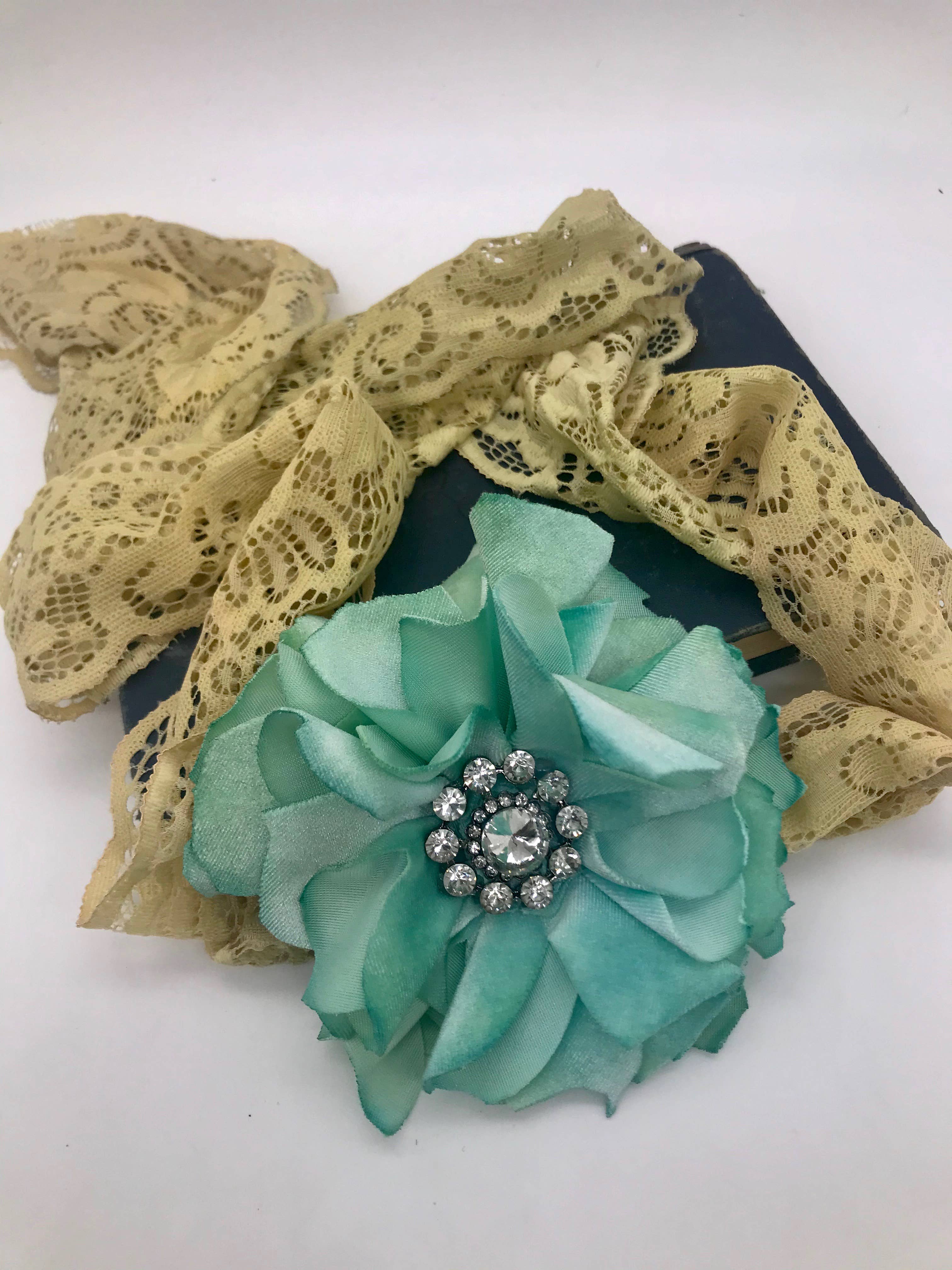 Hand-made and vintage 5-inch Velvet Flower with Crystal Button center on 2-inch wide Vintage Lace. Lace is 30-inches long and is stretchable to be used as a Headband or Cuff. Available in a variety of sizes and colors.