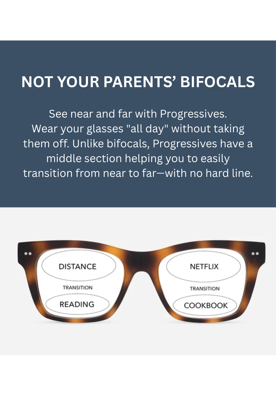 See near and far with Progressives. Wear your glasses "all day" without taking them off. Unlike bifocals, Progressives have a middle section helping you to easily transition from near to far—with no hard line.