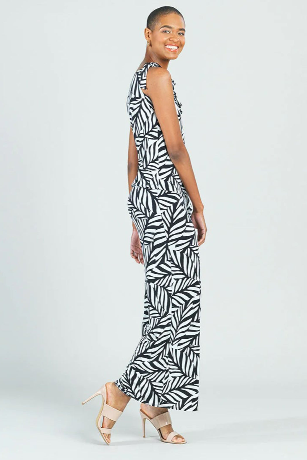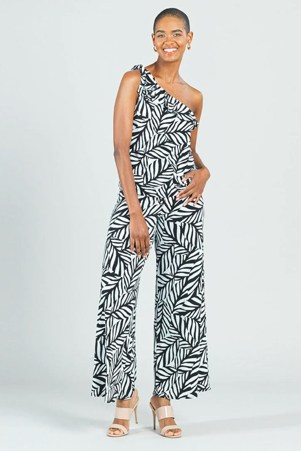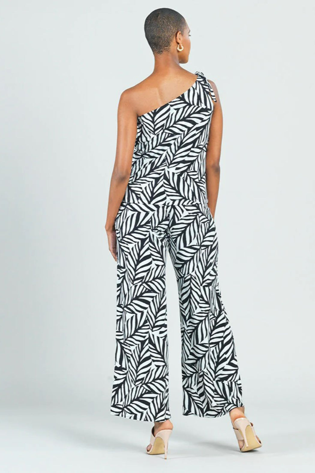 This style features a ruffled, asymmetrical neckline created by a sleek, one-shoulder, bra-friendly strap which displays a charming, ribbon-tie detail, and a straight hemline. A large-scale leaf print in a stripe-like cluster, comprised of white and black shades. Each piece is a unique, one-of-a-kind print and print placement will vary.