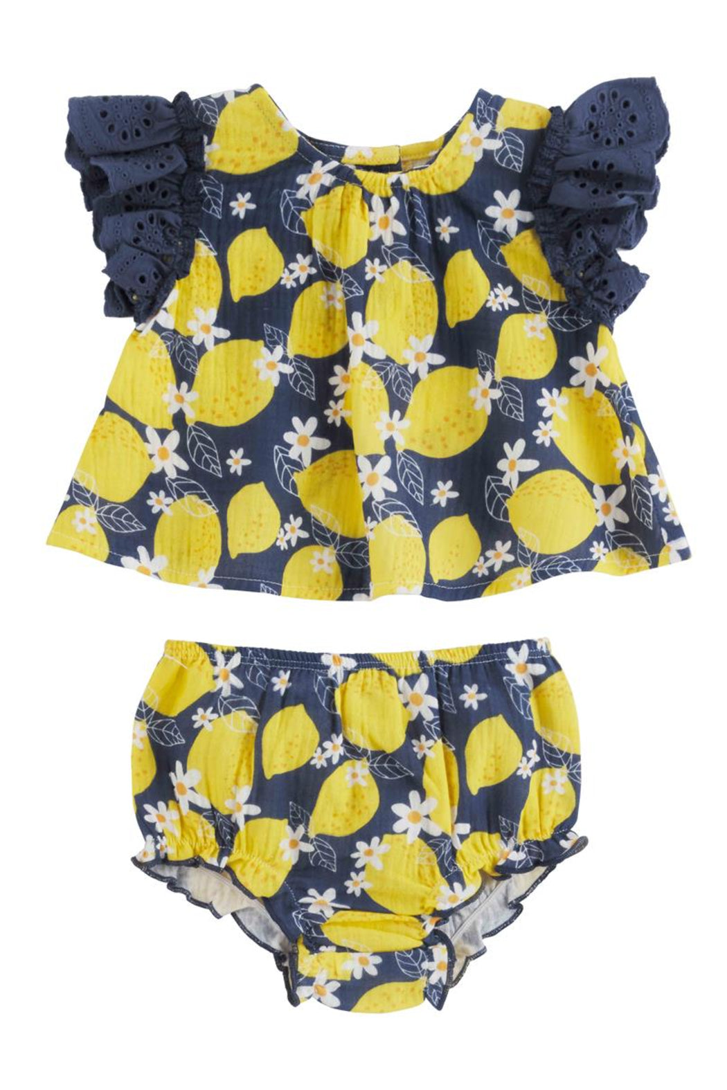 2-piece set. Cotton gauze pinafore with eyelet flutter sleeves. Comes with bloomers.