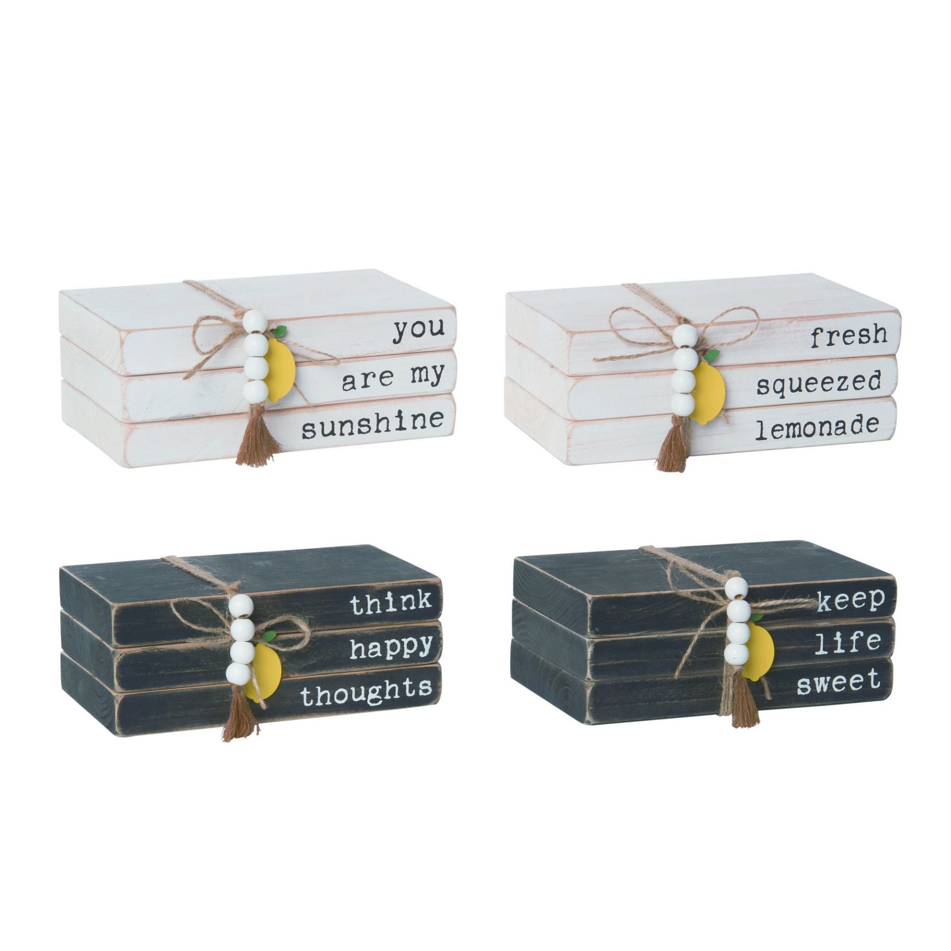 Spruce up your farmhouse decor with our Lemon Wood Block Book Decor. This unique stack of blocks comes complete with a burlap tie and charming lemon and wood bead tassels. A perfect addition to add a touch of whimsy to any room!