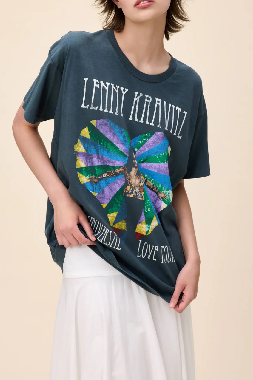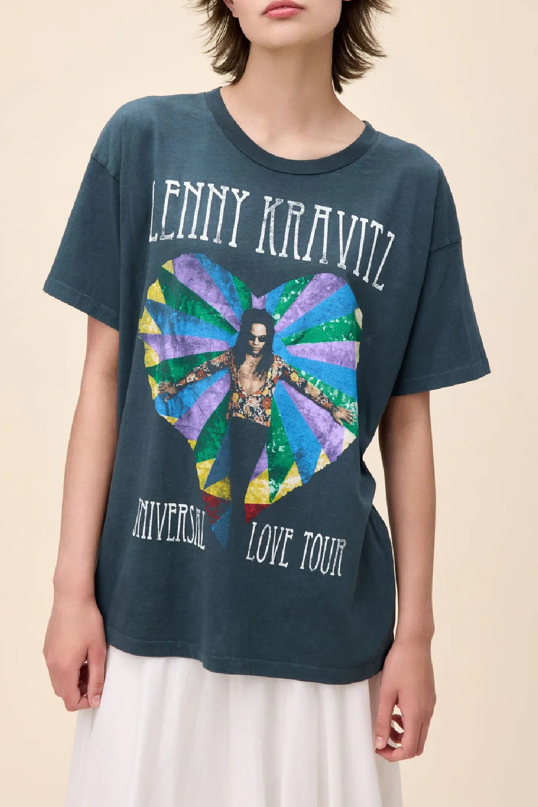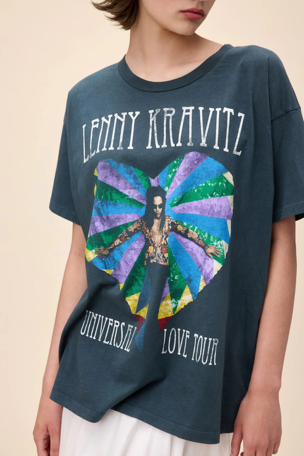 Soaring in strong with a debut album of "Let Love Rule," Lenny Kravitz cemented the beginning of his career with a multi-genre blend, later receiving four consecutive Grammy Awards for 'Best Male Rock Vocal Performance.' Landing on our roster, the energetic and eclectic icon is tributed with a Merch Tee featuring his Universal Love Tour with a portrait of fashion forward and naturally charismatic Kravitz in a multi-colored heart graphic with the tour details stamped on the back. Fit and Fabric: The Merch Tee is an oversized fit, designed in our midweight cotton to achieve the perfect drape. Accented with an open neckline and an authentic single needle ladder stitch at all hems. Model wears size S. 100% Cotton. Hand wash cold, lay flat to dry.