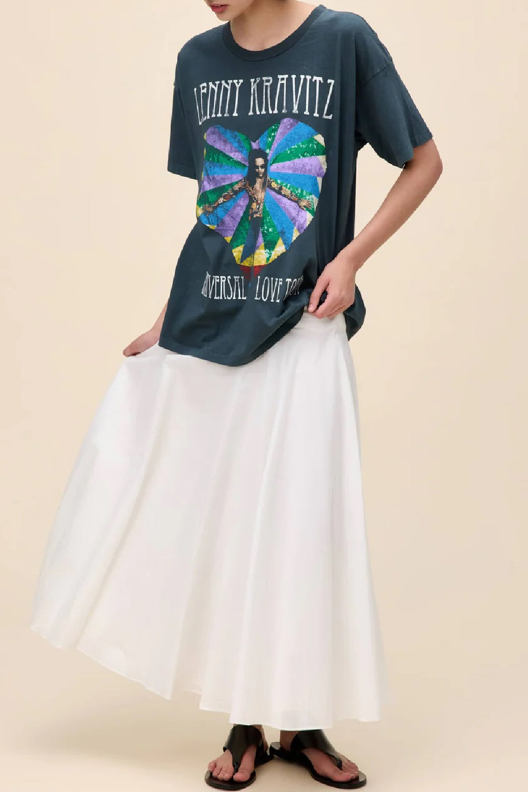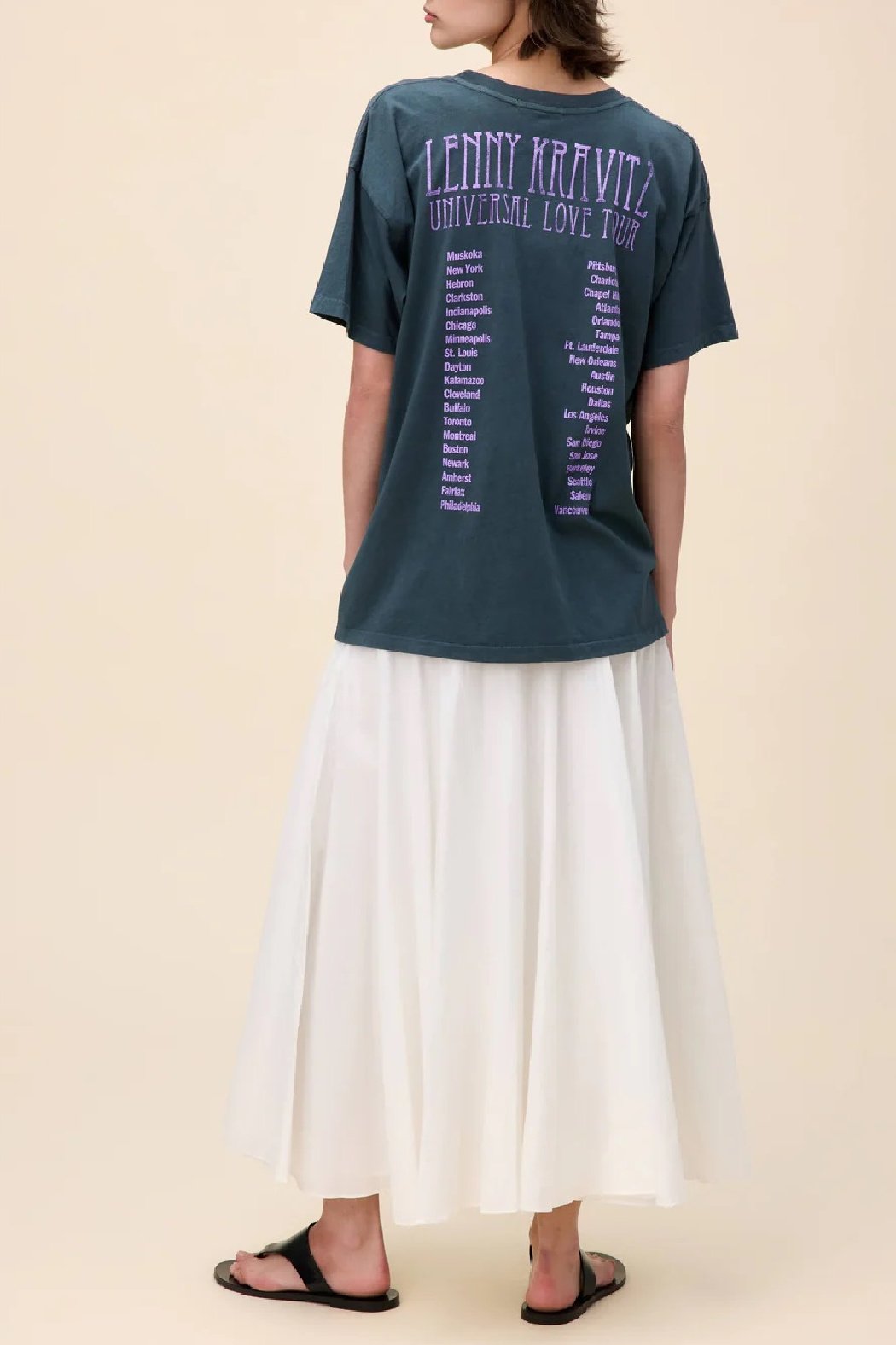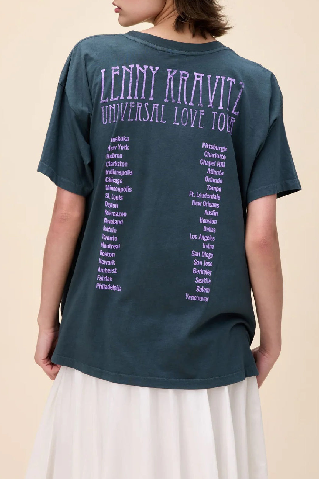 Soaring in strong with a debut album of "Let Love Rule," Lenny Kravitz cemented the beginning of his career with a multi-genre blend, later receiving four consecutive Grammy Awards for 'Best Male Rock Vocal Performance.' Landing on our roster, the energetic and eclectic icon is tributed with a Merch Tee featuring his Universal Love Tour with a portrait of fashion forward and naturally charismatic Kravitz in a multi-colored heart graphic with the tour details stamped on the back. Fit and Fabric: The Merch Tee is an oversized fit, designed in our midweight cotton to achieve the perfect drape. Accented with an open neckline and an authentic single needle ladder stitch at all hems. Model wears size S. 100% Cotton. Hand wash cold, lay flat to dry.