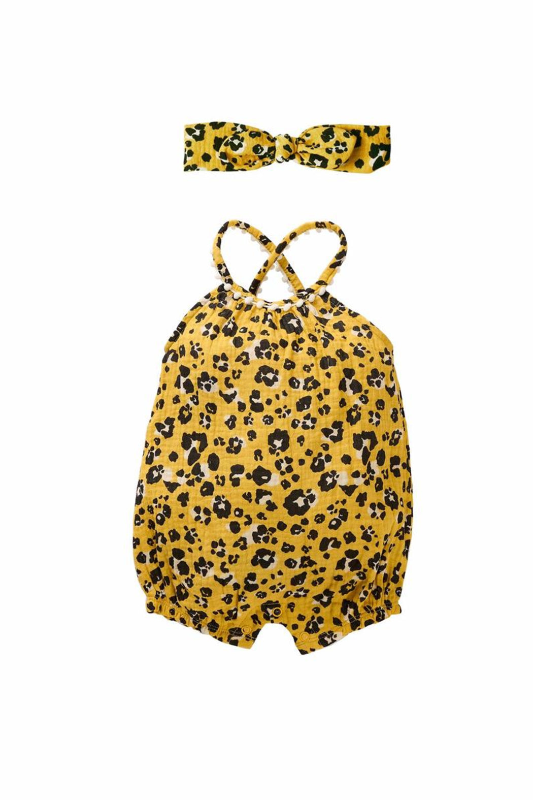 2-piece set. Cotton gauze bubble with pom trim neckline. Comes with bow headband.