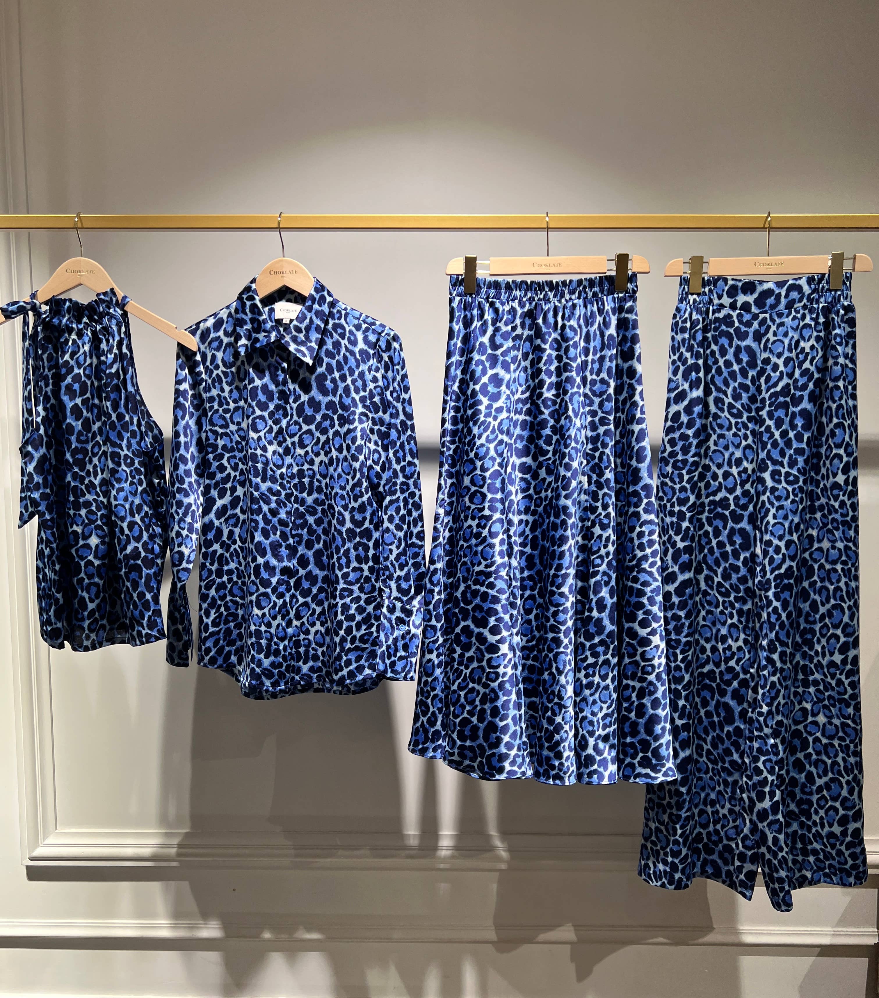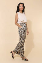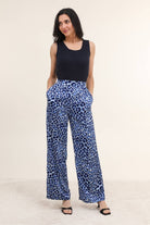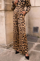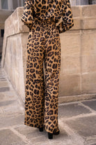 Satin fluid fabric pants, Leopard print, Palazzo cut, Elastic waistband, Side pockets. A perfect match with the following tops in the same leopard prints.