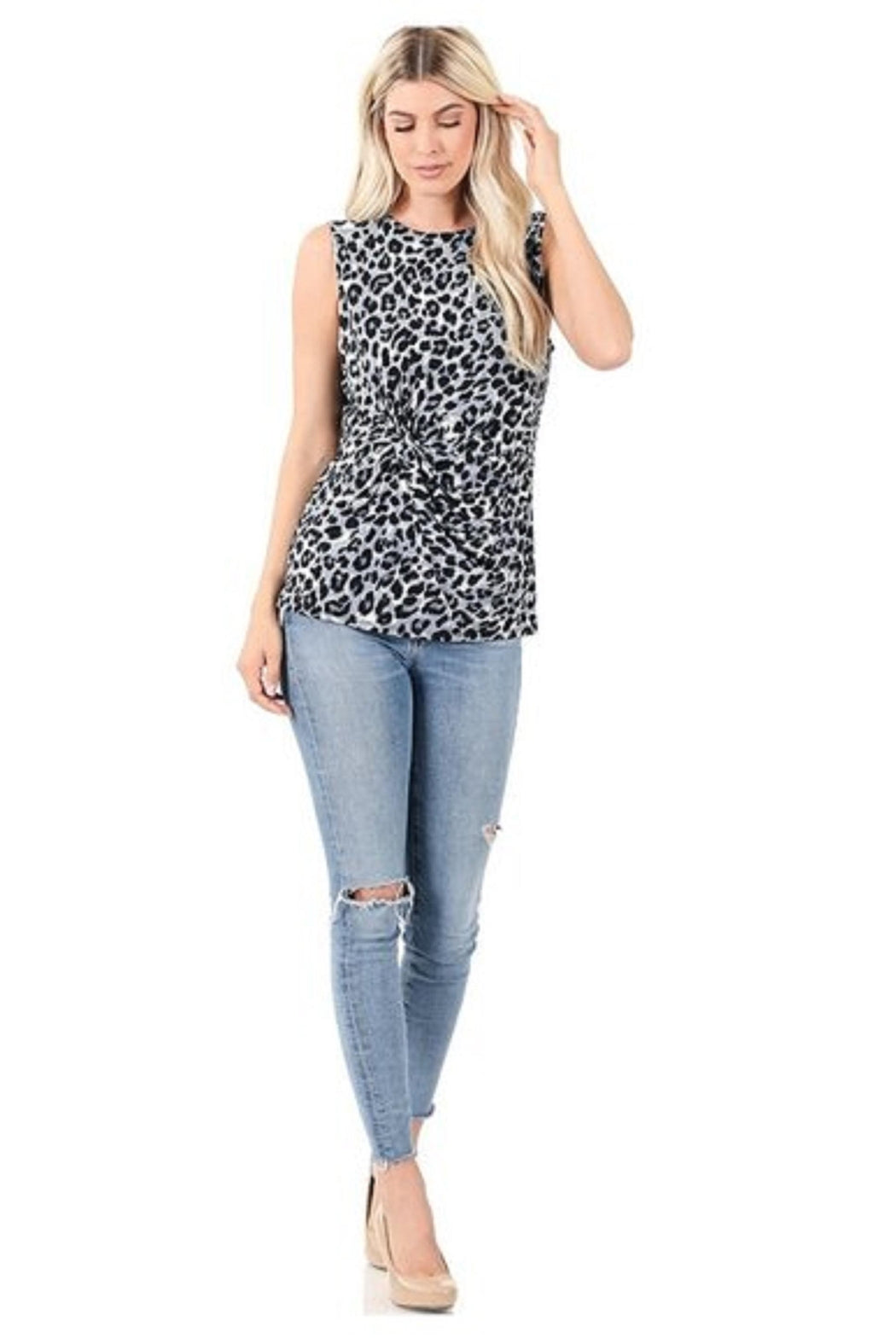 Leopard Print Top - Knotted Front Sleeveless Top - Gray