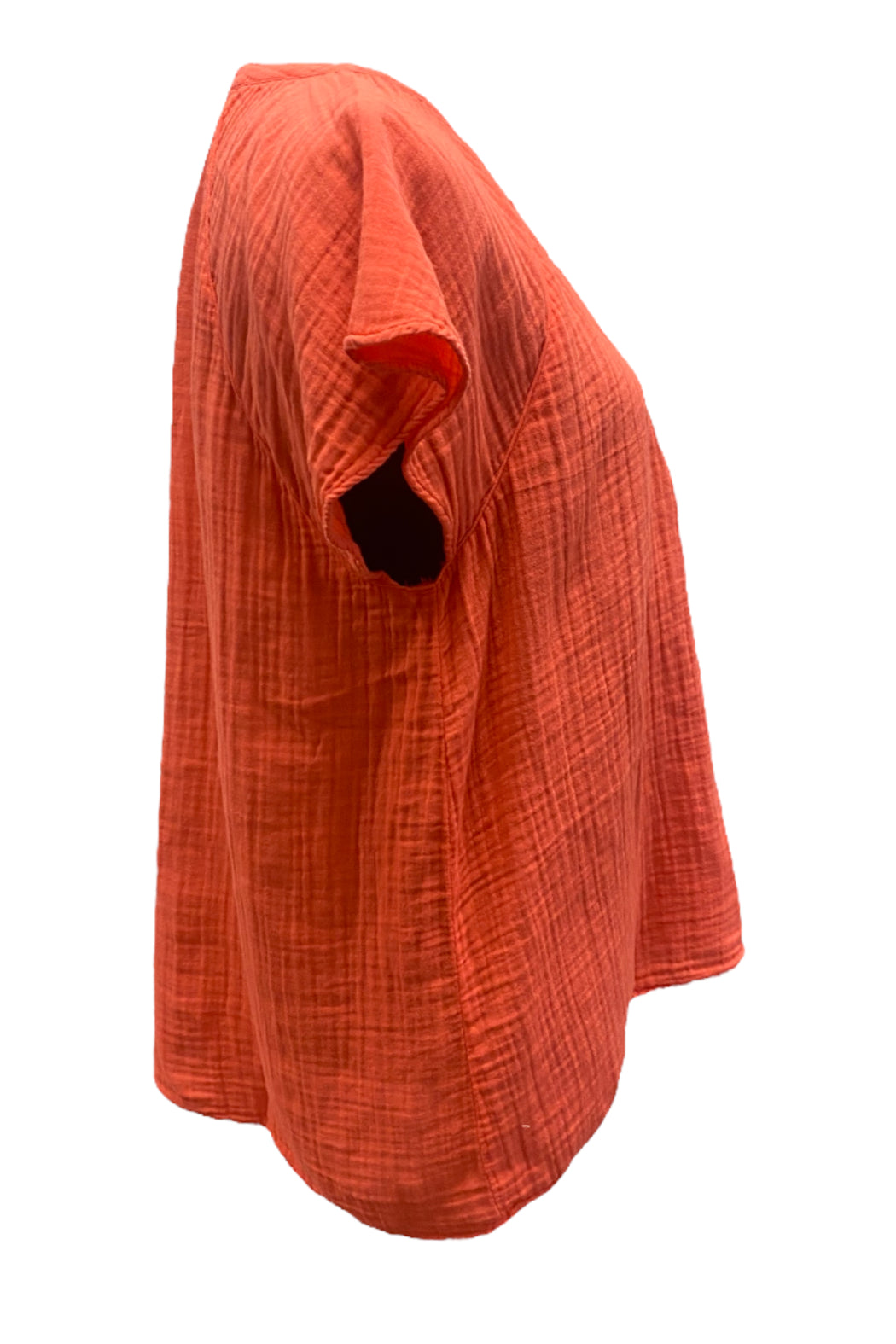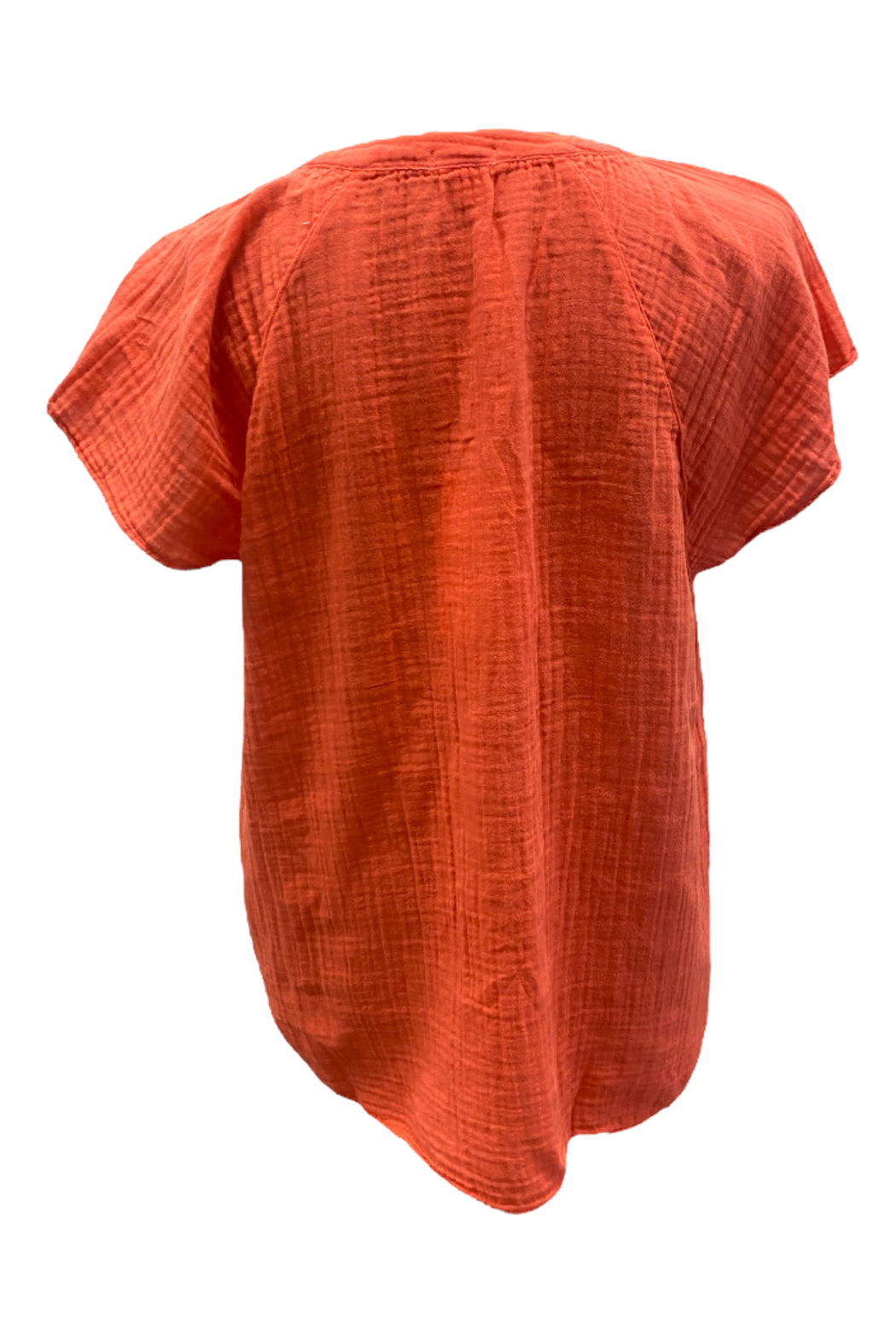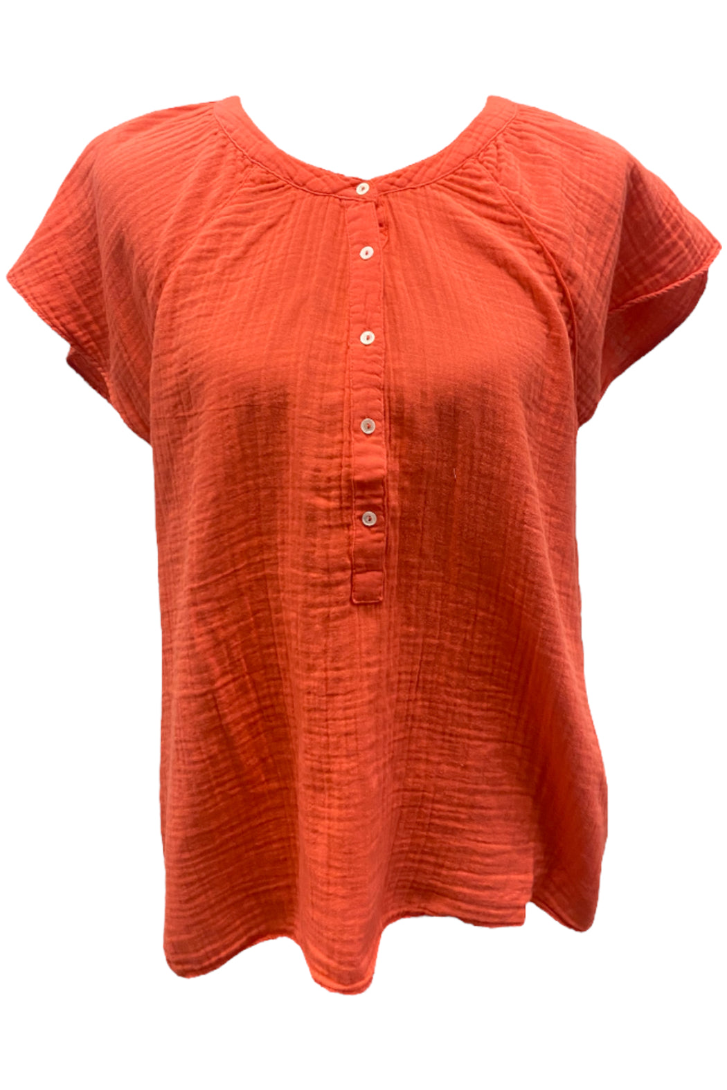 Gauzy fabric with dropped shoulders and button front placket and dolman short sleeve