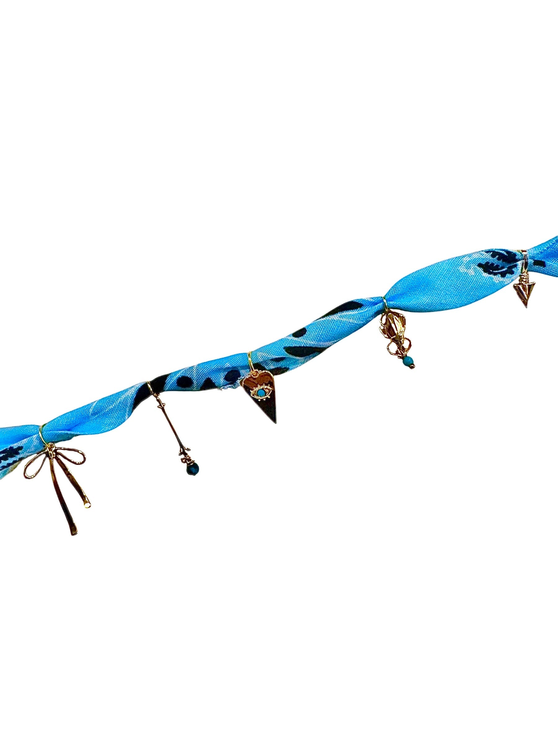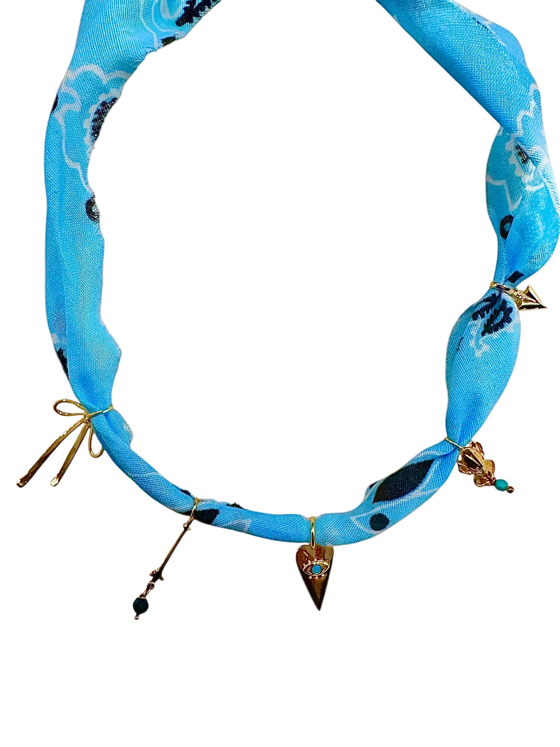 Light Blue Bandana Necklace with gold plated charms featuring turquoise stones. Elevate your summertime style with this unique statement piece.