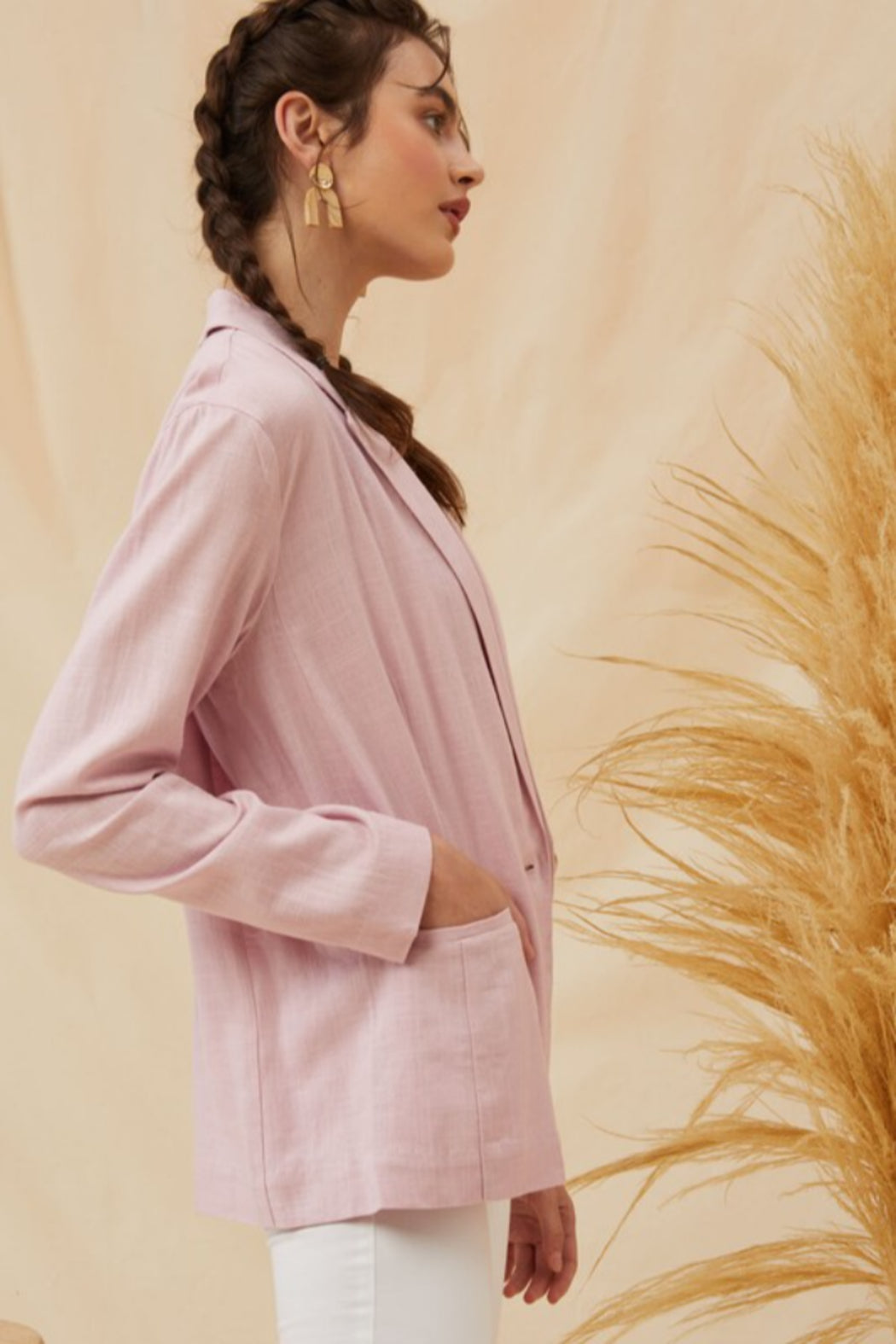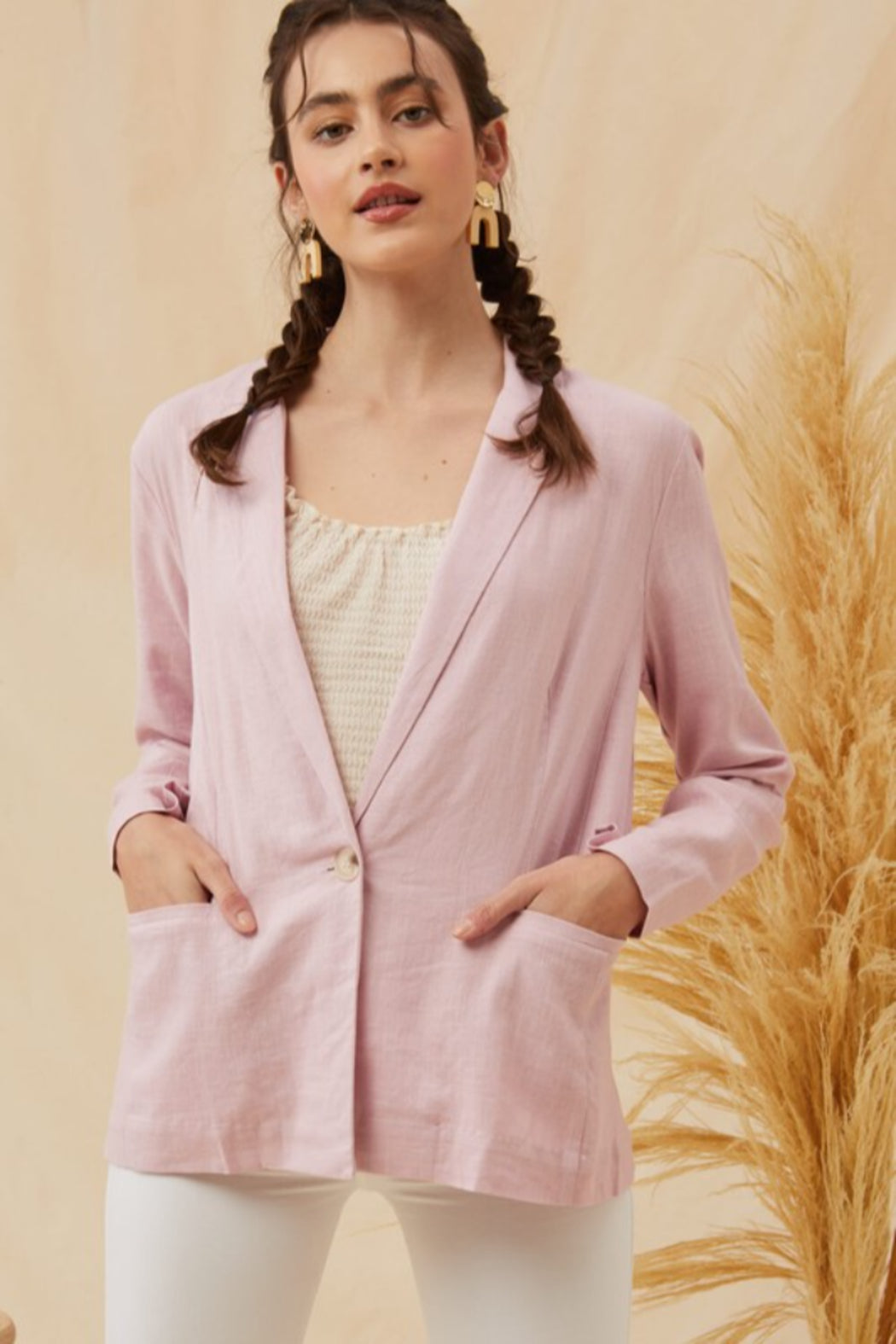 Long sleeve lightweight linen blazer with lapel collar, pockets, and button closure.
