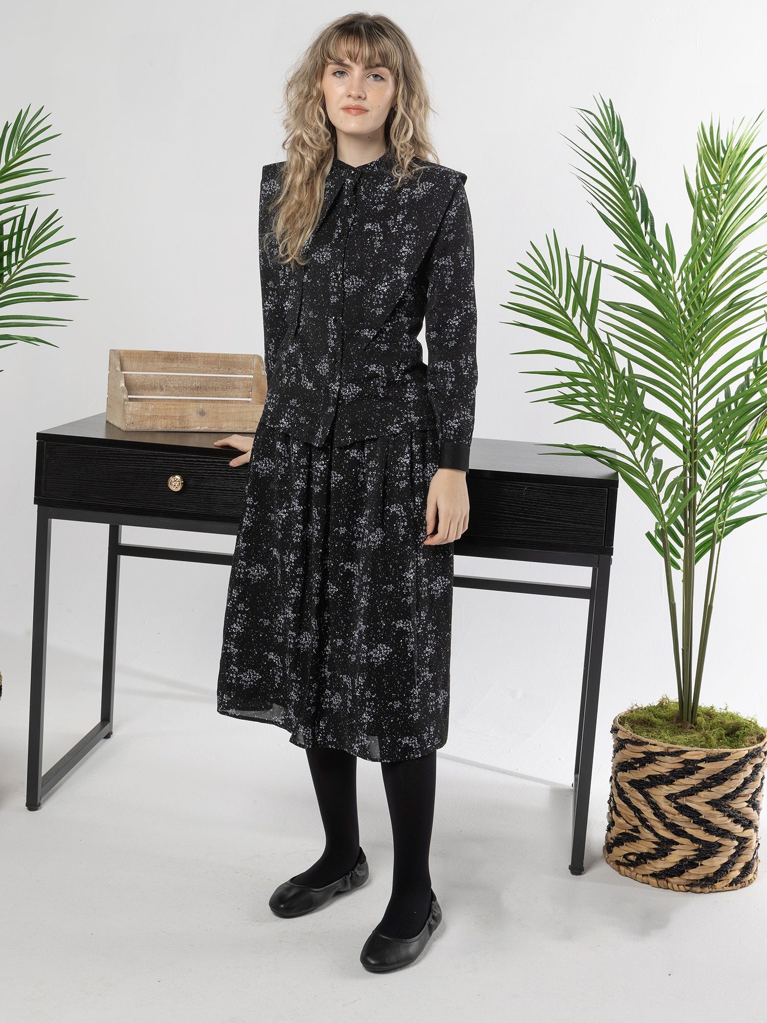 •LOOK: This gently shaped button down shirt has long sleeves with a wide elastic at the wrist. There is an added interest of a pointed panel in the same print on the front reaching around the yoke of the back. Pair this with a black skirt or pant now and lighten it up with white next spring. There is a matching skirt in the same lightweight material for that one piece dressing look.