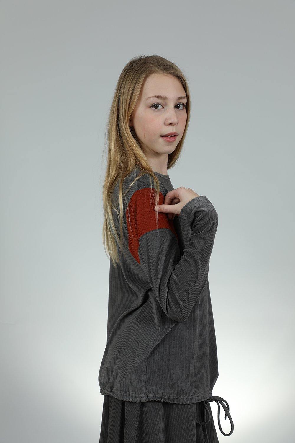 •LOOK: Ribbed pattern, crew neck, orange shoulders in the grey version / blue shoulders in the black version, elastic waistband with drawstrings.