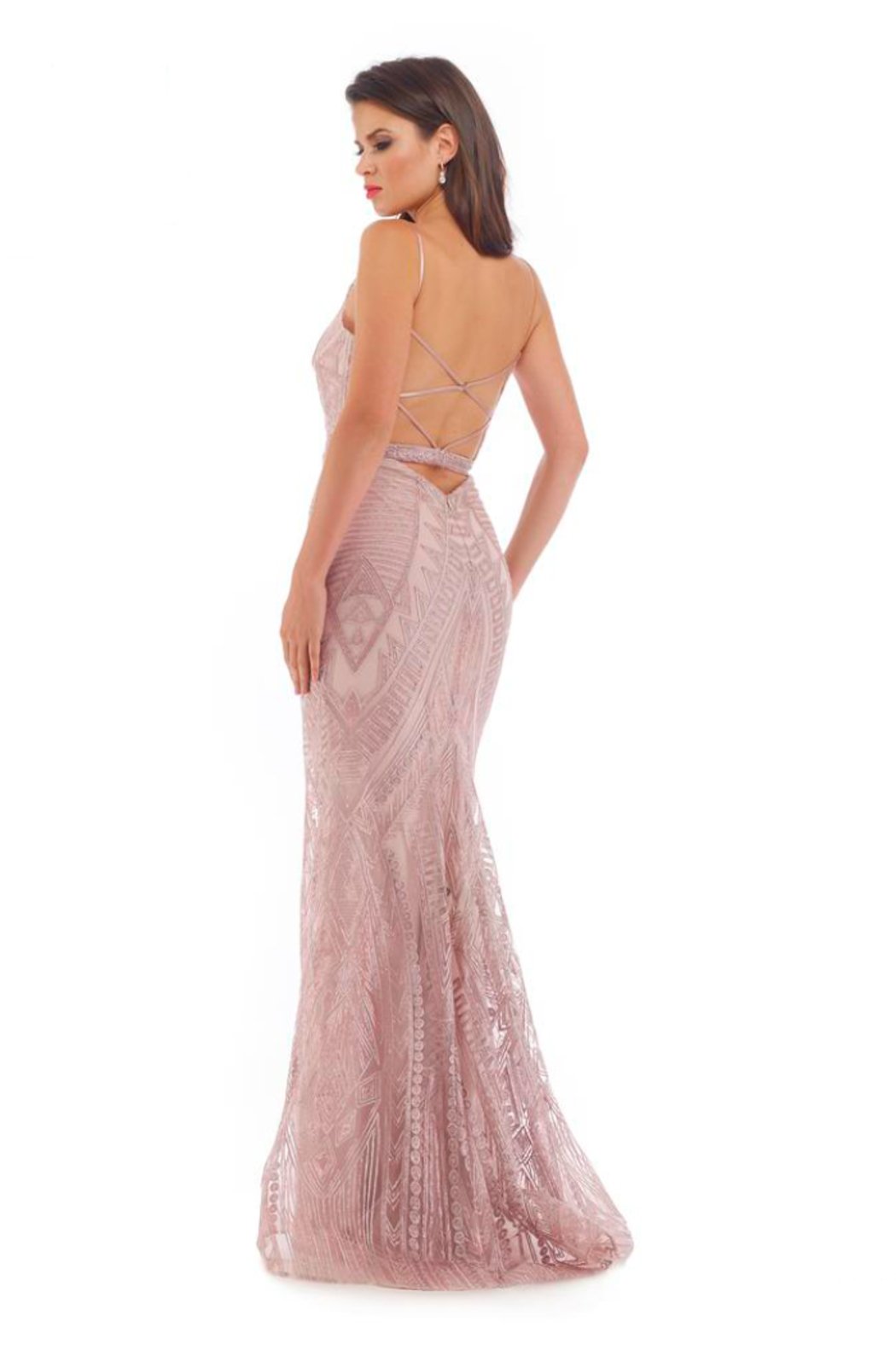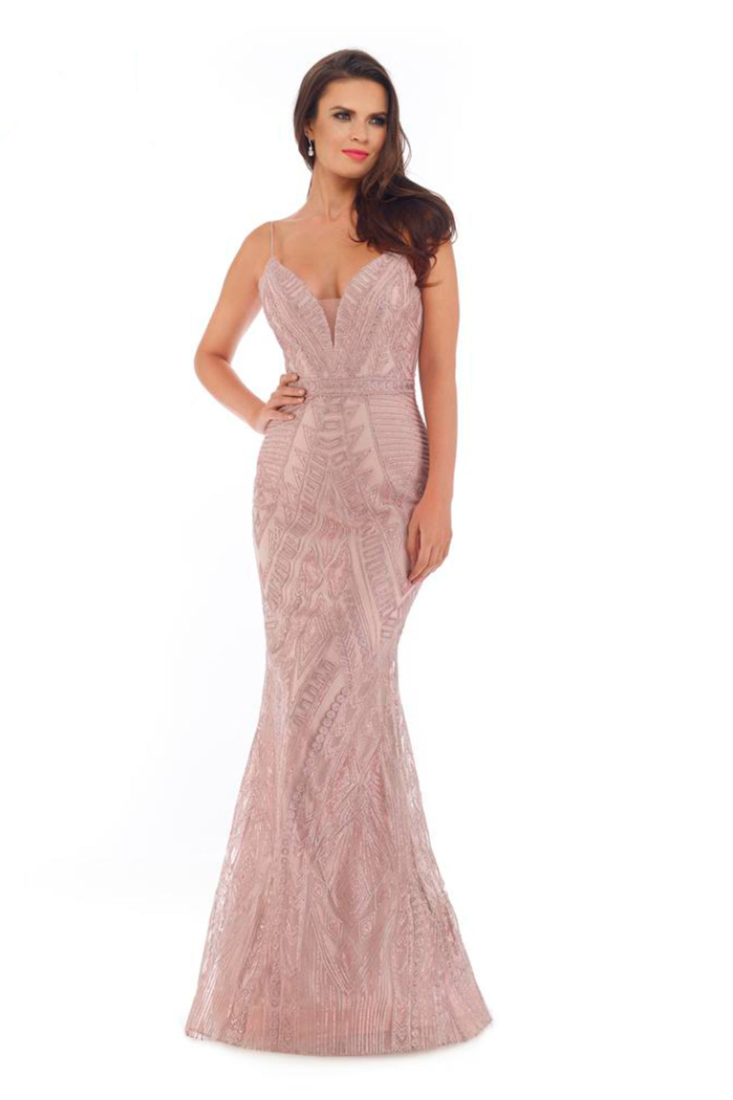 Designed with a sexy plunging V-neckline with mesh, this dress is ready to impress with embellishments, spaghetti straps, and strappy open back with a zipper closure. Adding to the look is the trumpet silhouette with a sweep train to finish the whole look. Exhibit your softer side in this delightful evening gown by Morrel Maxie.