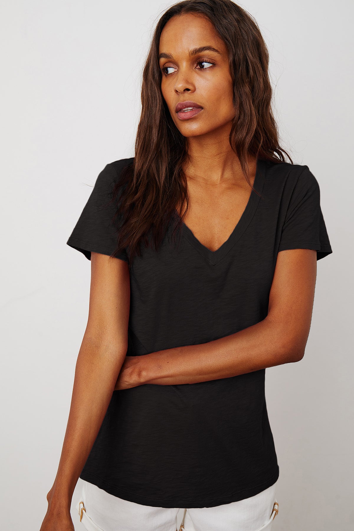 This is a great v-neck tee. A little bit preppy with a pinch of tomboy style, it's the perfect basic. Cut from our luxe cotton slub, it's super soft, washes beautifully and hugs your body in all the right spots.