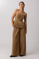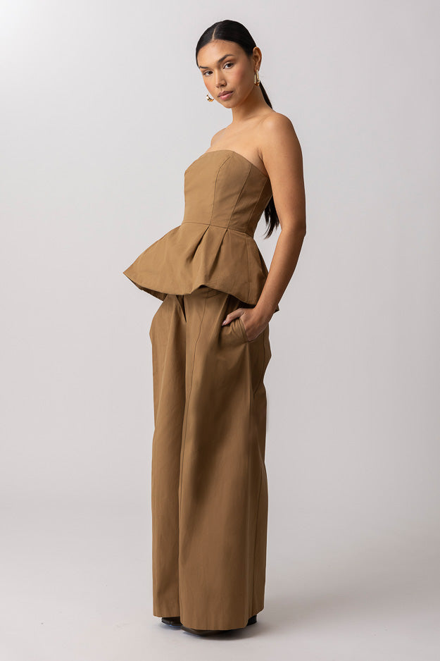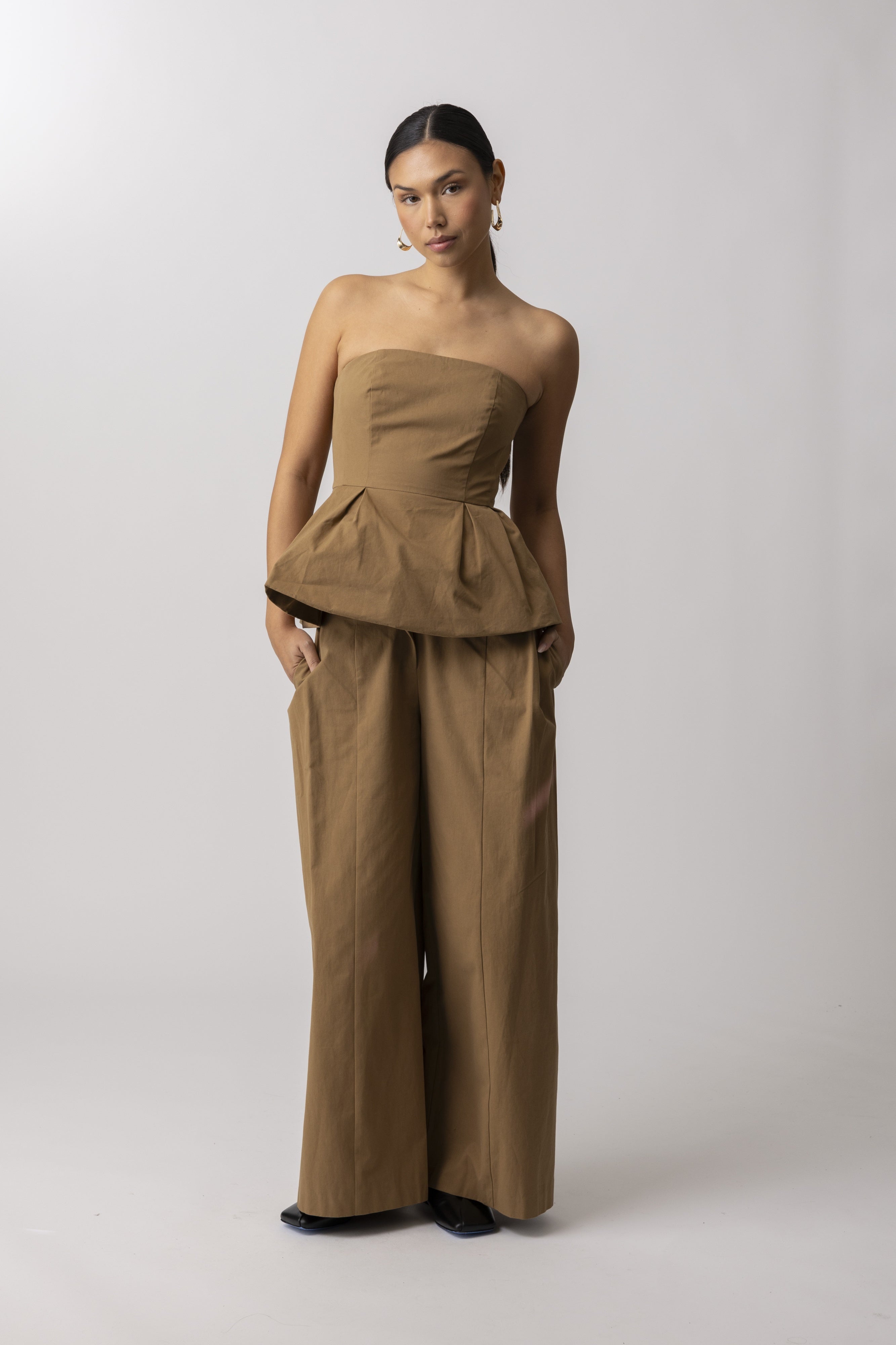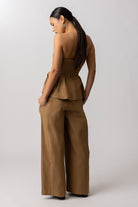 The Tove Pants from Line & Dot feature a neutral color scheme, a wide-leg silhouette, and a relaxed, comfortable fit.