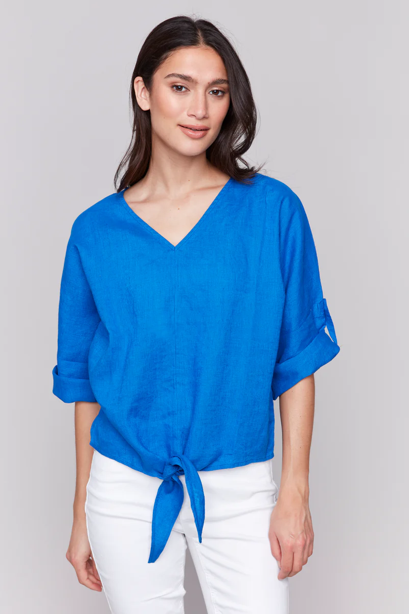 LINEN BLEND 3/4 SLEEVE TOP WITH FRONT TIE