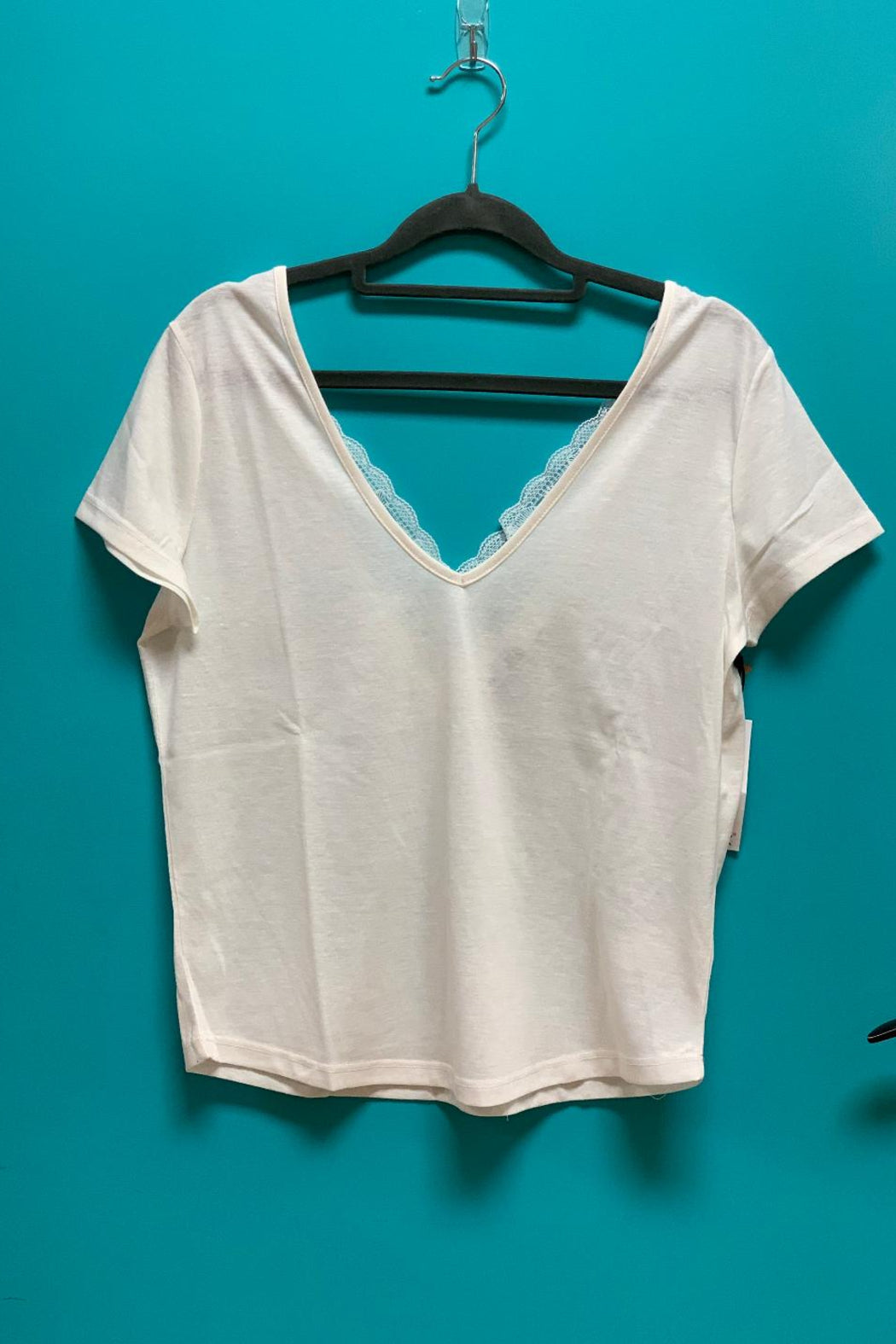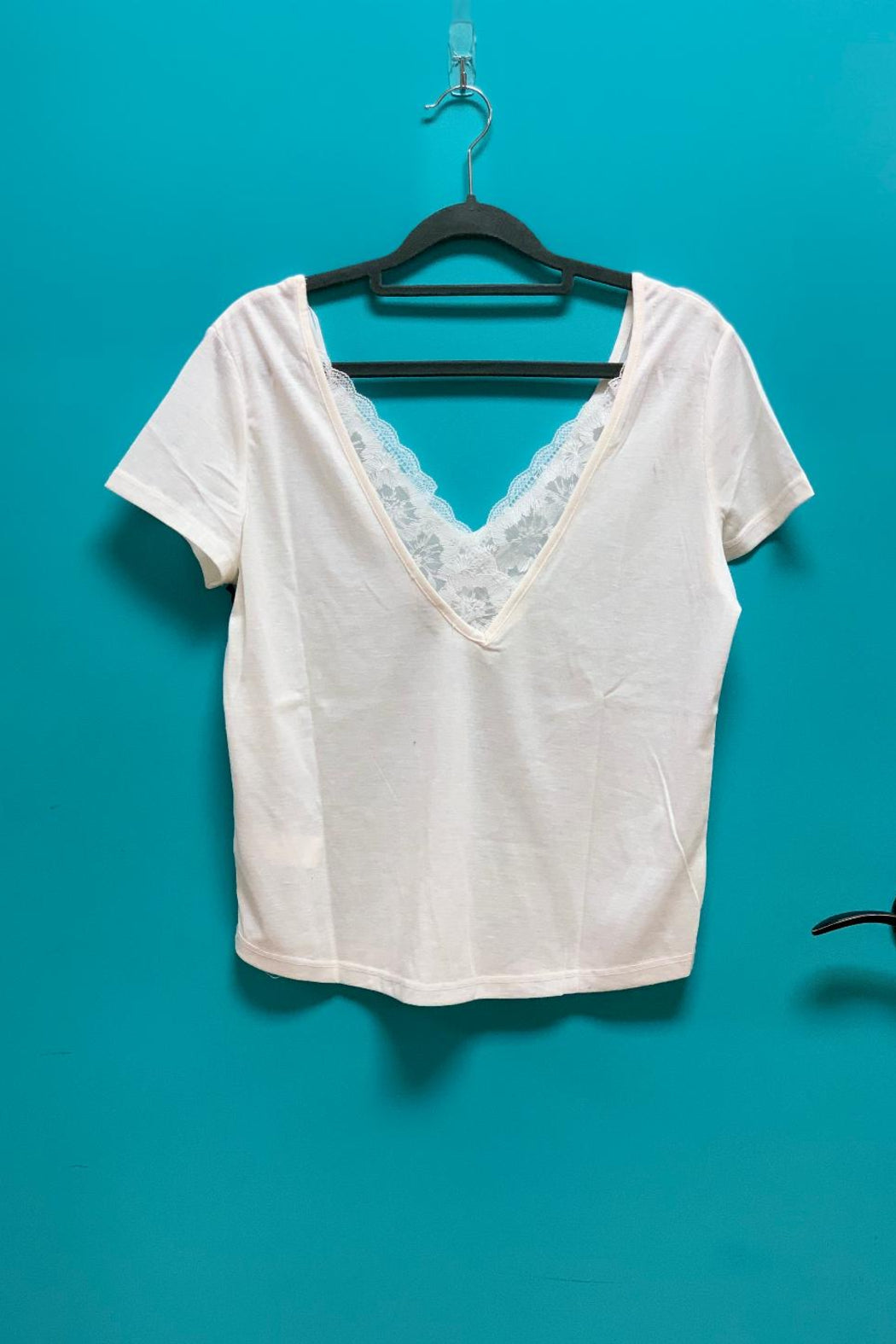 This short sleeve shirt features a double v neck with lace trim on one side. This top can be reversed and worn with the lace in the front or the back.