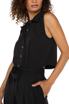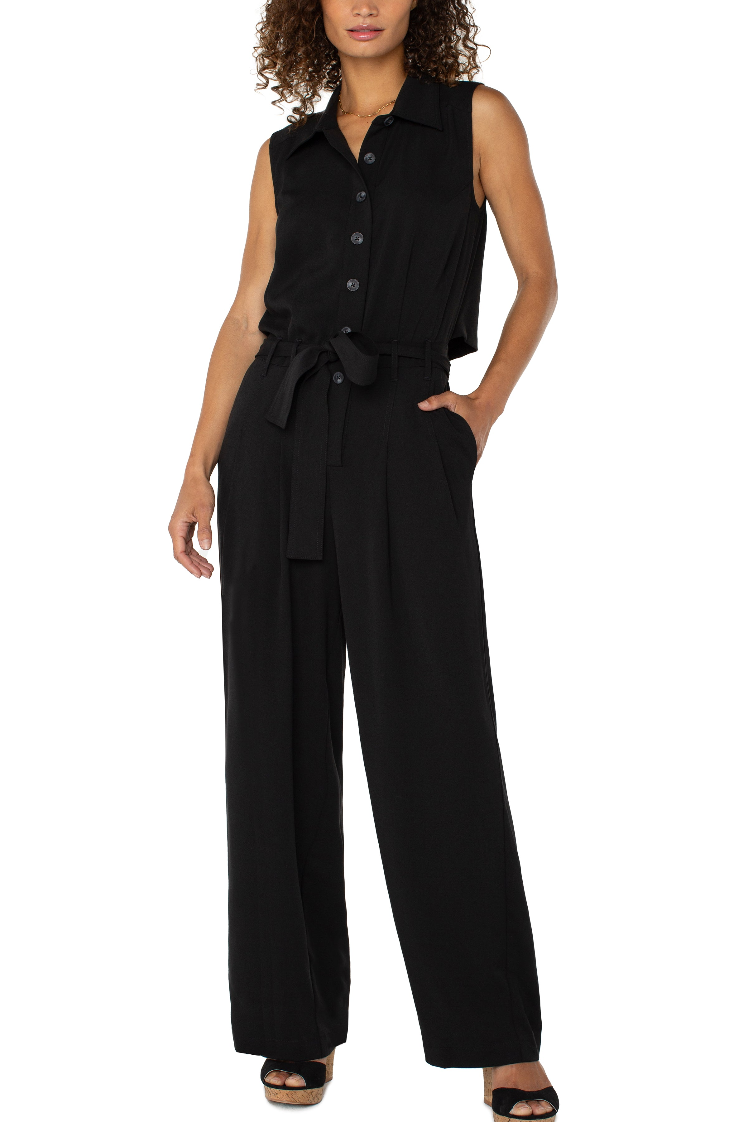 Step up your fashion game with this chic sleeveless jumpsuit. Designed with a classic collar and a six-button front closure, it blends timeless elegance with a contemporary fit. The back elastic waistband offers a flattering shape, while the inverted back pleat enhances movement and adds a sophisticated touch.
