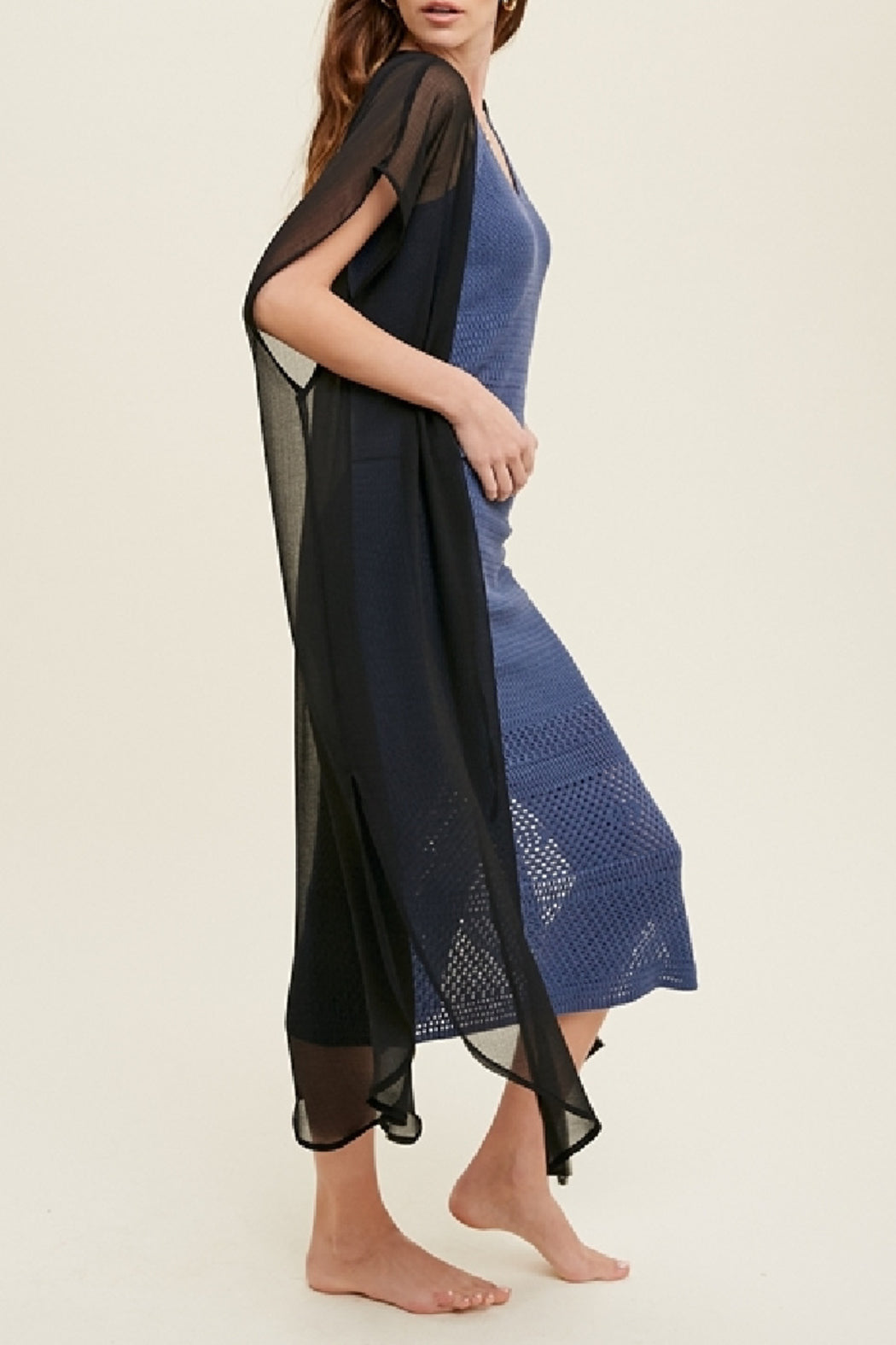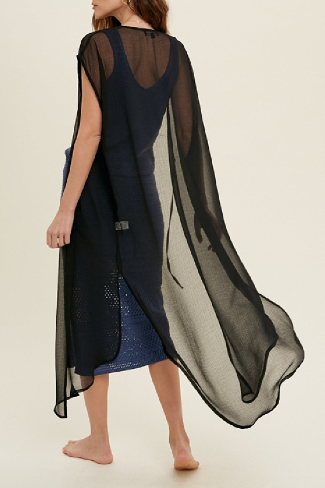 Long, sleeveless black sheer kimono. Tie front and side slits. Model is wearing a size s/m. Refer to measurements for your perfect fit. Across chest measurements; S/M 28", M/L 30". Shoulder to hem; S/M 48.5", M/L 49.5".