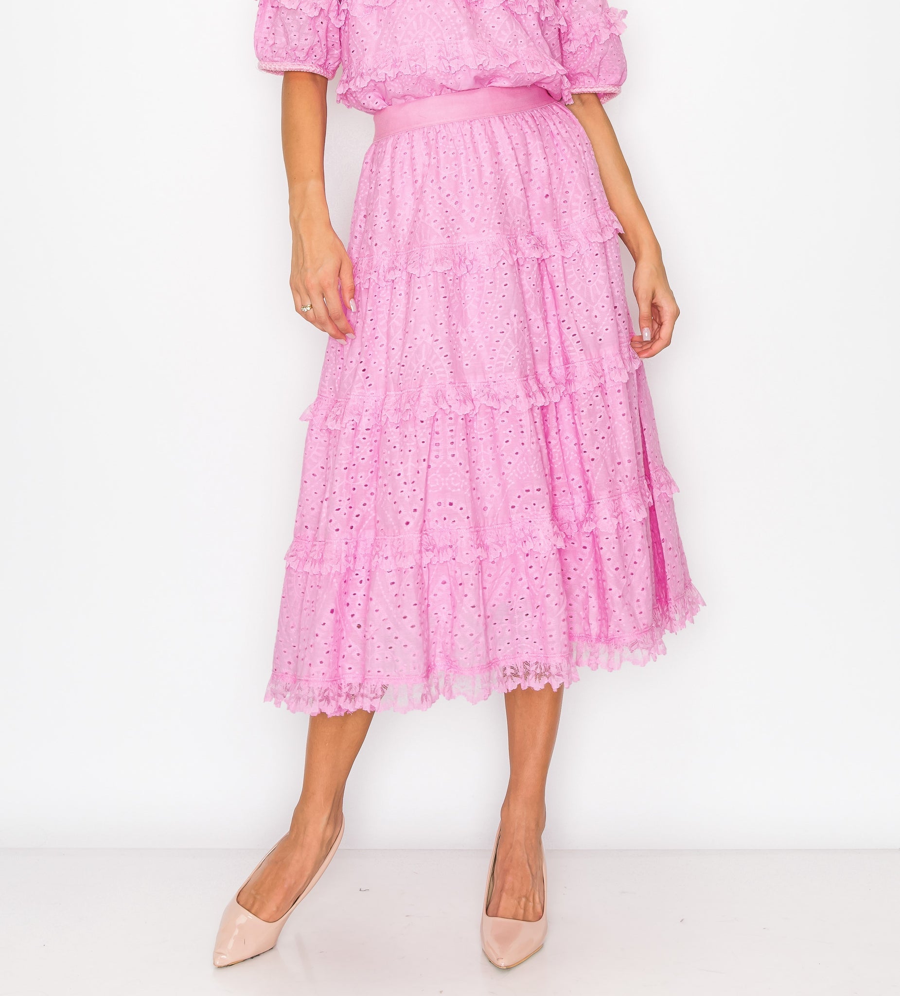 The Lizzie A-line bubblegum pink tiered skirt by Joh Apparel. Made with very high quality cotton lace eyelet. Slightly ruffled. Elastic waist for the perfect fit. Fully lined. Drapes beautifully. Easy relax fit. Style this skirt with the matching Laura top (style # 33083LA). Perfect everyday wear.
