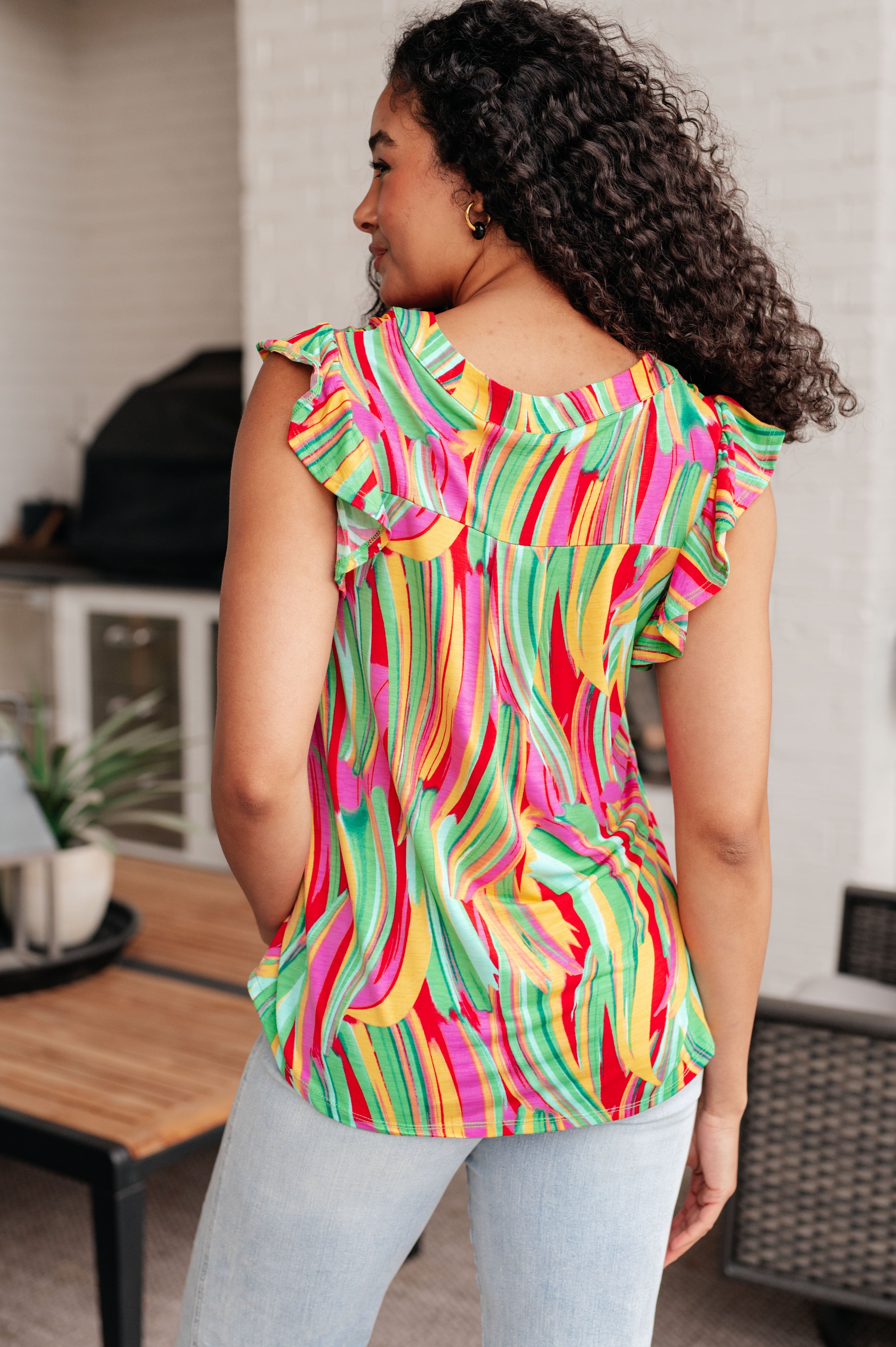 Lizzy Flutter Sleeve Top in Green Multi Abstract Stripe