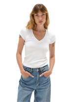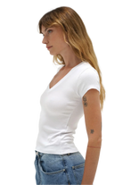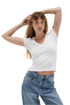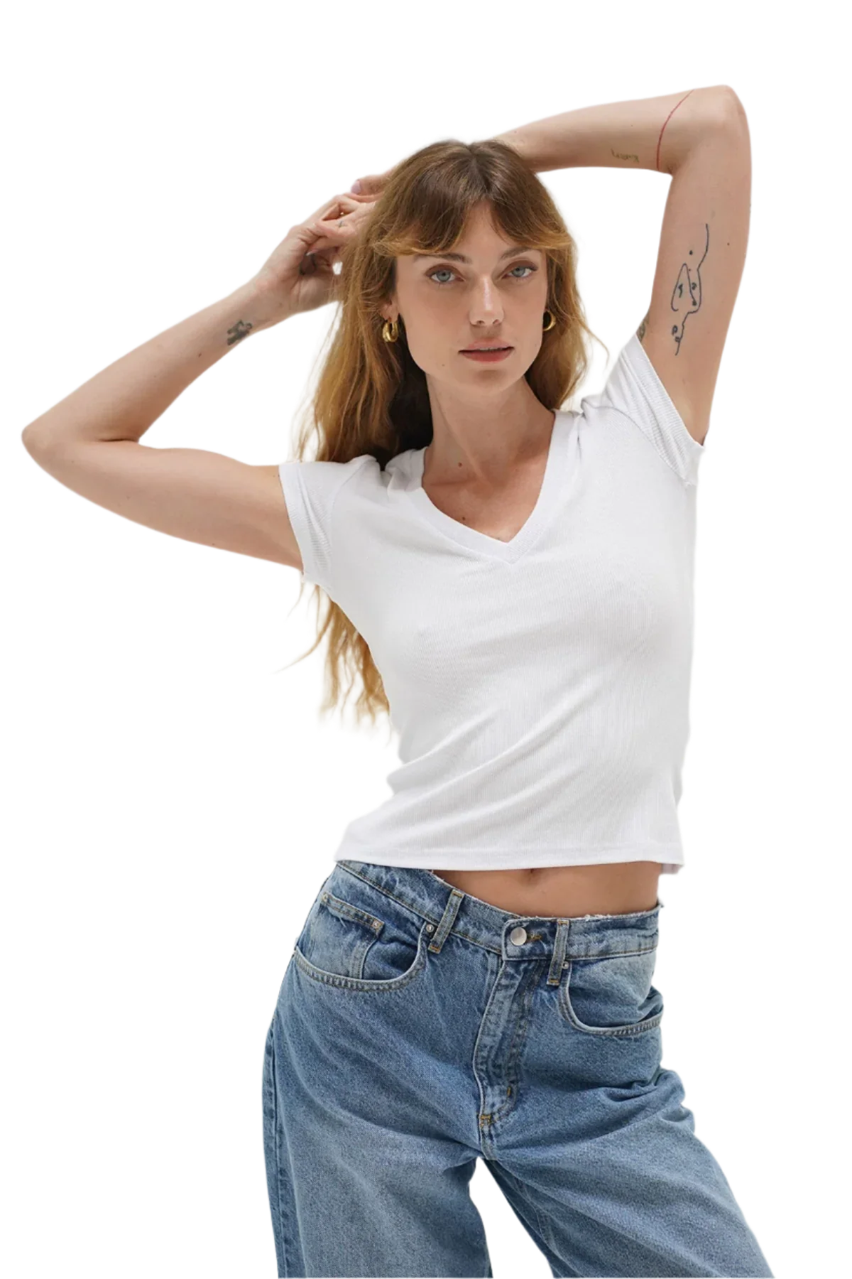 This 2x1 rib fabric V Neck Essential boasts a slim fit and deep neckline. For a more relaxed look, we recommend sizing up. This tee is designed to hit the top of your pants.