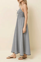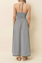 The Lolita Dress is a charming warm-weather staple. Featuring a fully smocked bodice with separated woven cups, it offers a flattering, flexible fit. A delicate front bow detail and adjustable halter tie allow for customizable cup placement, while front pockets add a practical touch. Perfect for effortless summer styling.
