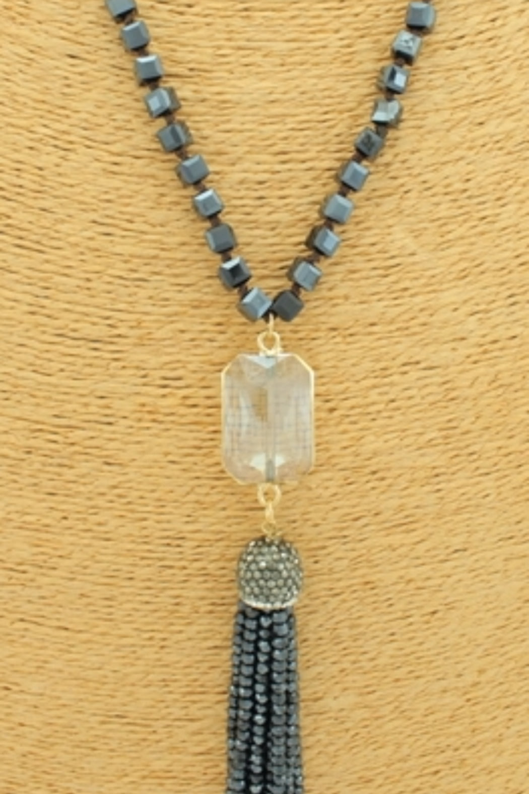 Gorgeous faceted beads on 32" knotted strand. Beads are faceted dark gray and iridescent. Clear 1"center stone with a 3-1/4" shimmery tassel. Stones are darker than appear on computer screen.