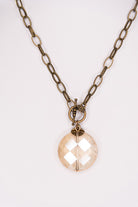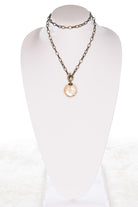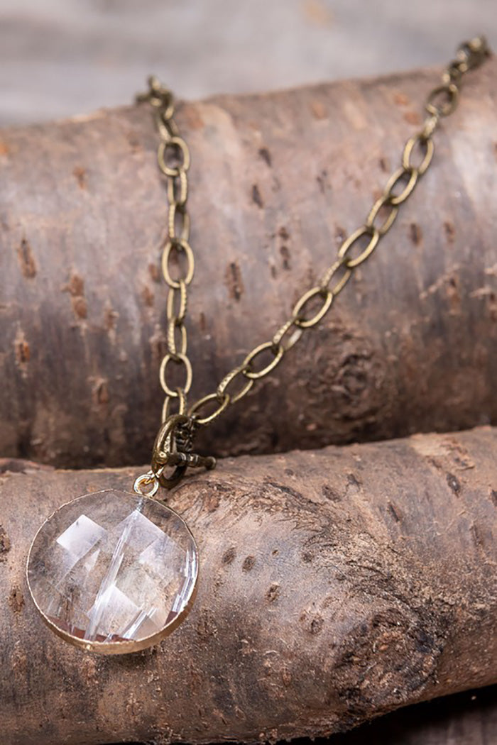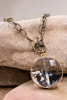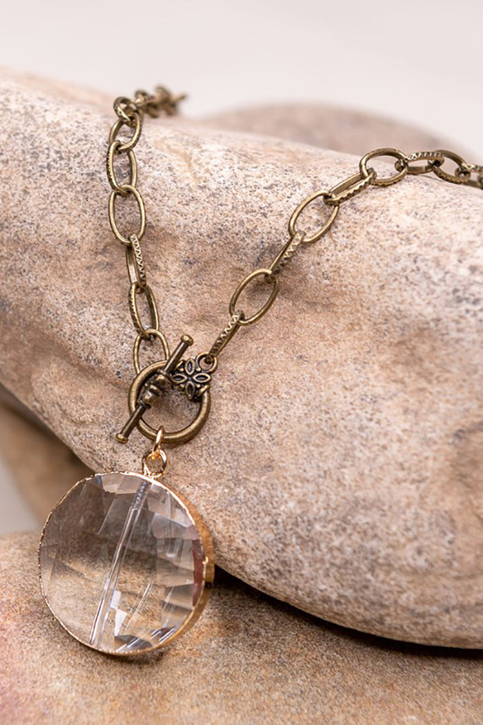 Long, link chain necklace with circular crystal pendant. Toggle closure next to pendant.