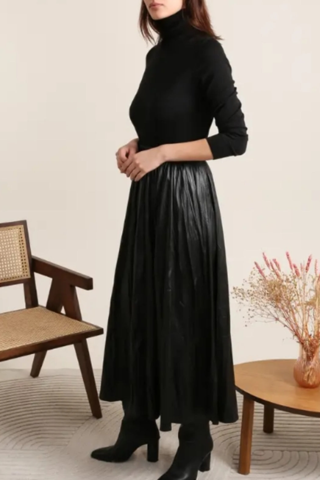* Final Sale! Long skirt in soft faux leather material, elastic band at the waist. The material is a machine washable fabric (to be washed inside out on the fabric side). • Care Instructions: Machine wash • Fabric: 100% POLYESTER
