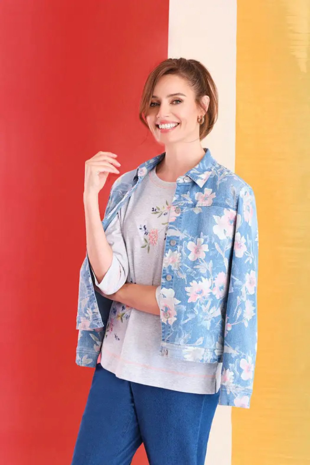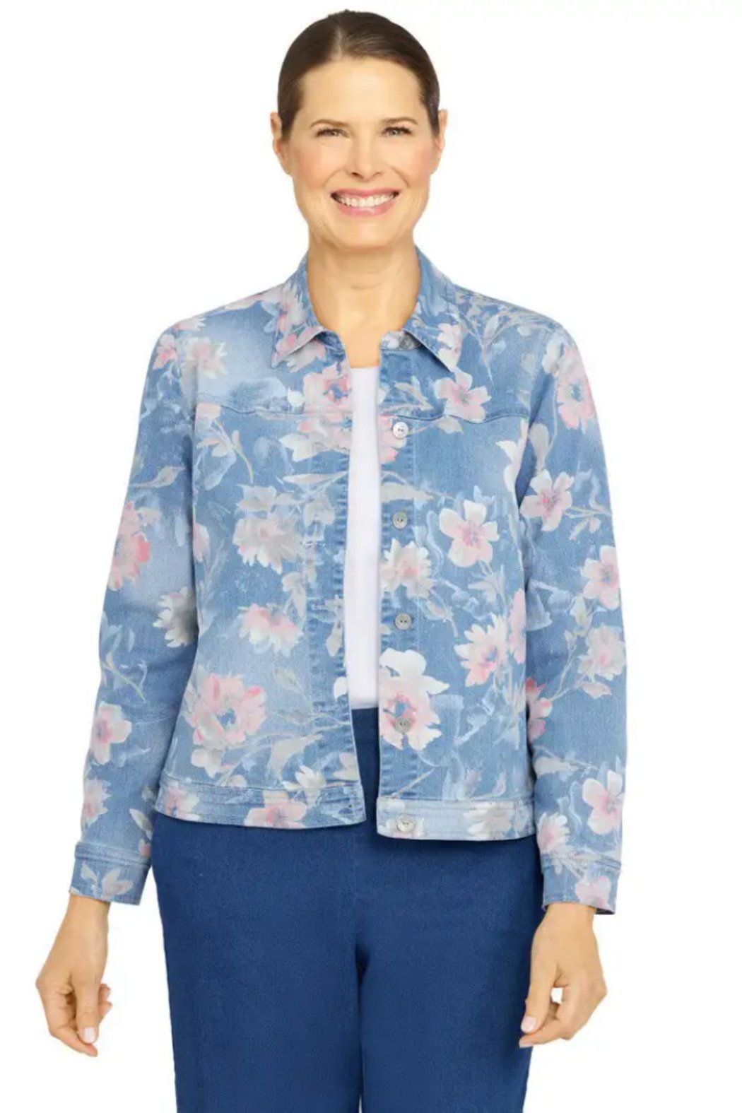 We dressed up our casual denim jacket with beautiful painterly florals. Features long sleeves and a collared neckline.