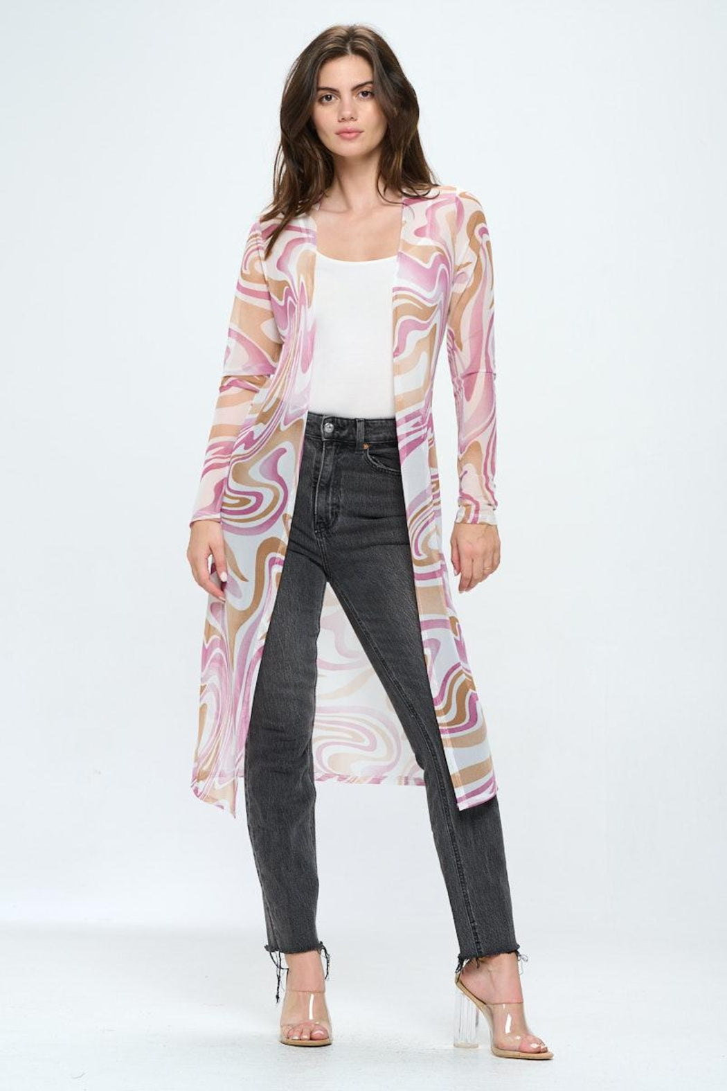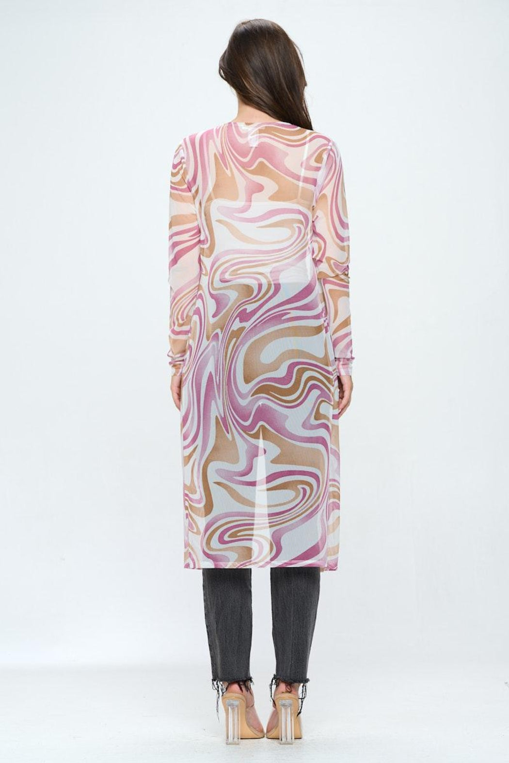 Long sleeve longline duster in swirl printed mesh by Miley + Molly