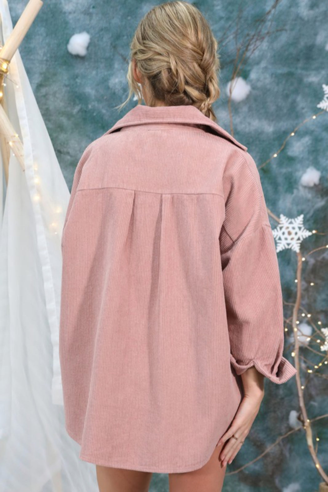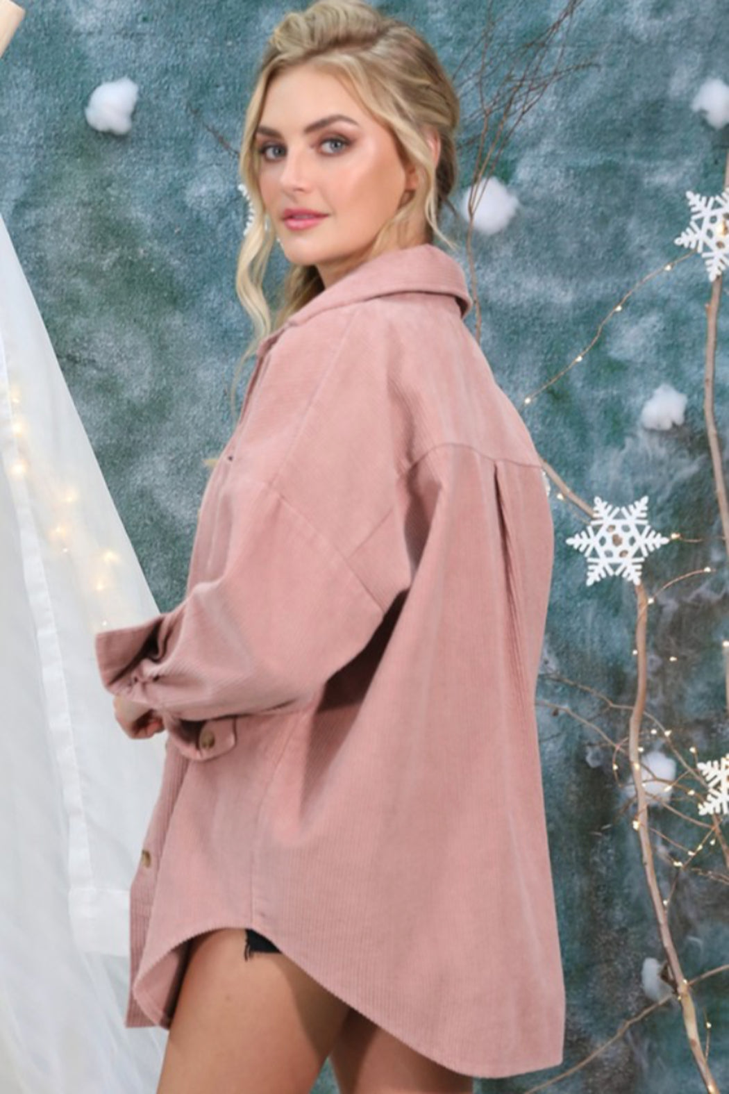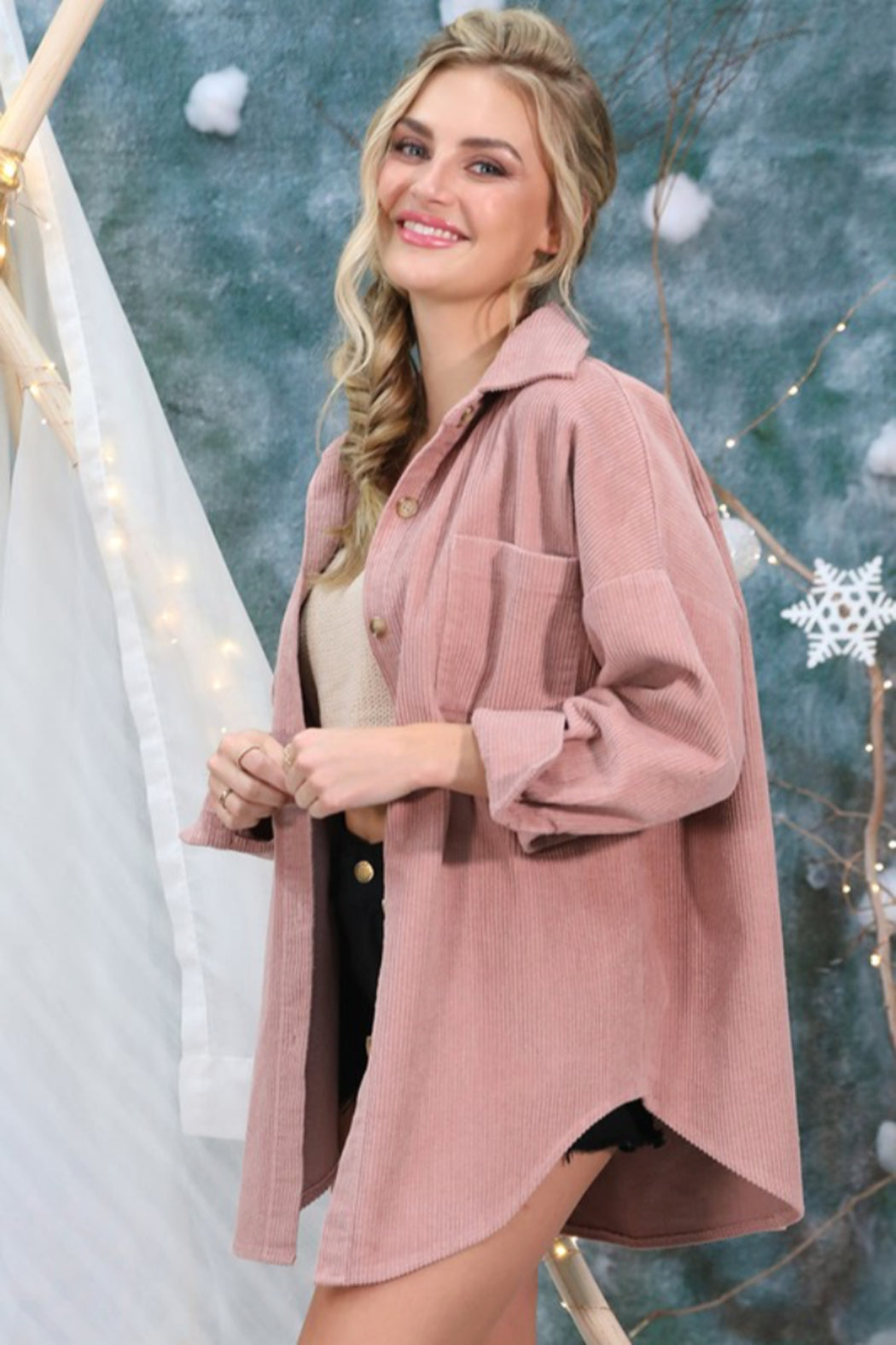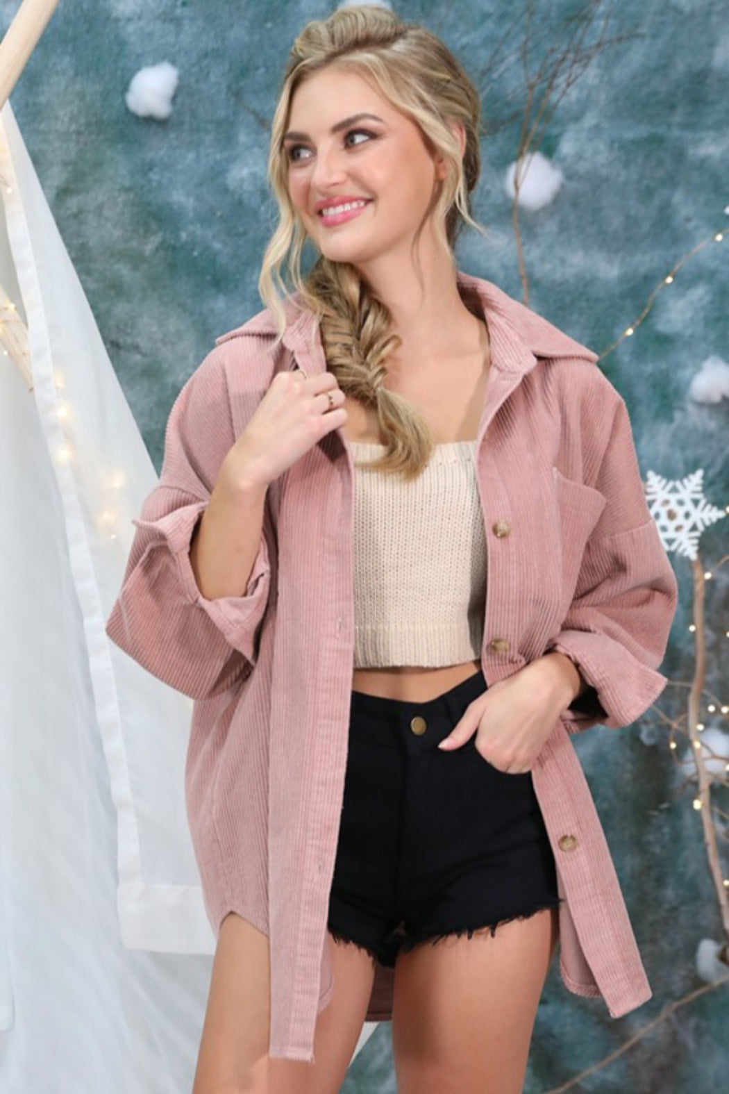 This loose fitting corduroy shirt jacket features a button closure, two chest pockets and functional button on each sleeve cuff.