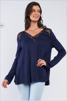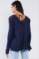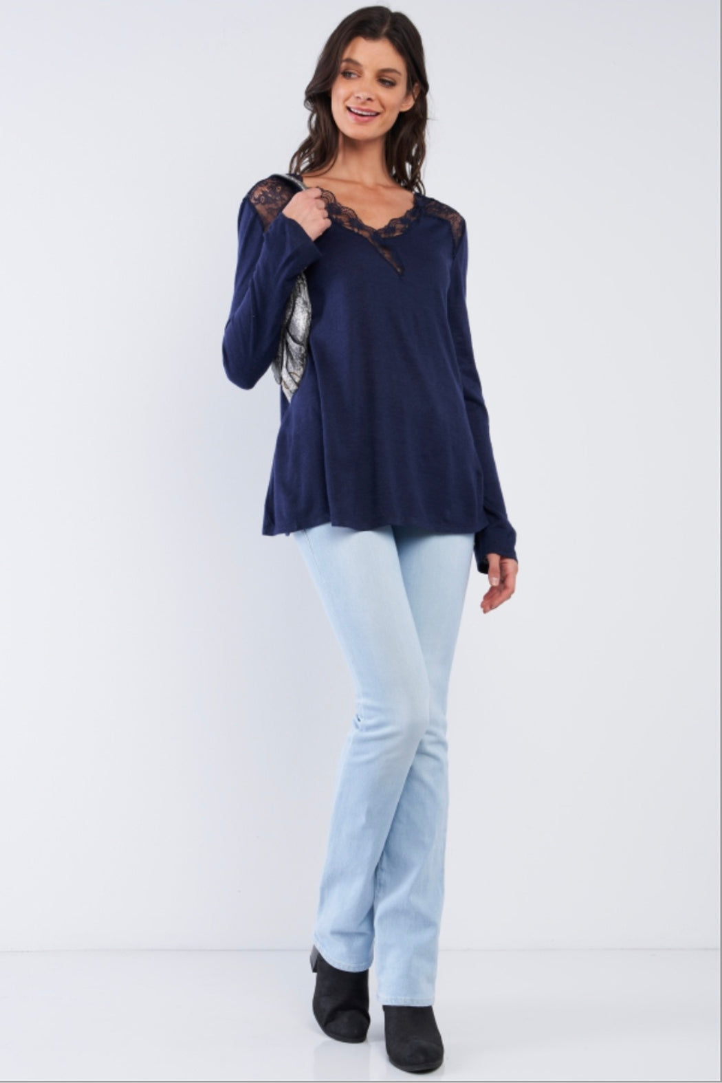 Loose Fit Long Sleeve Lace Hem V-Neck Top