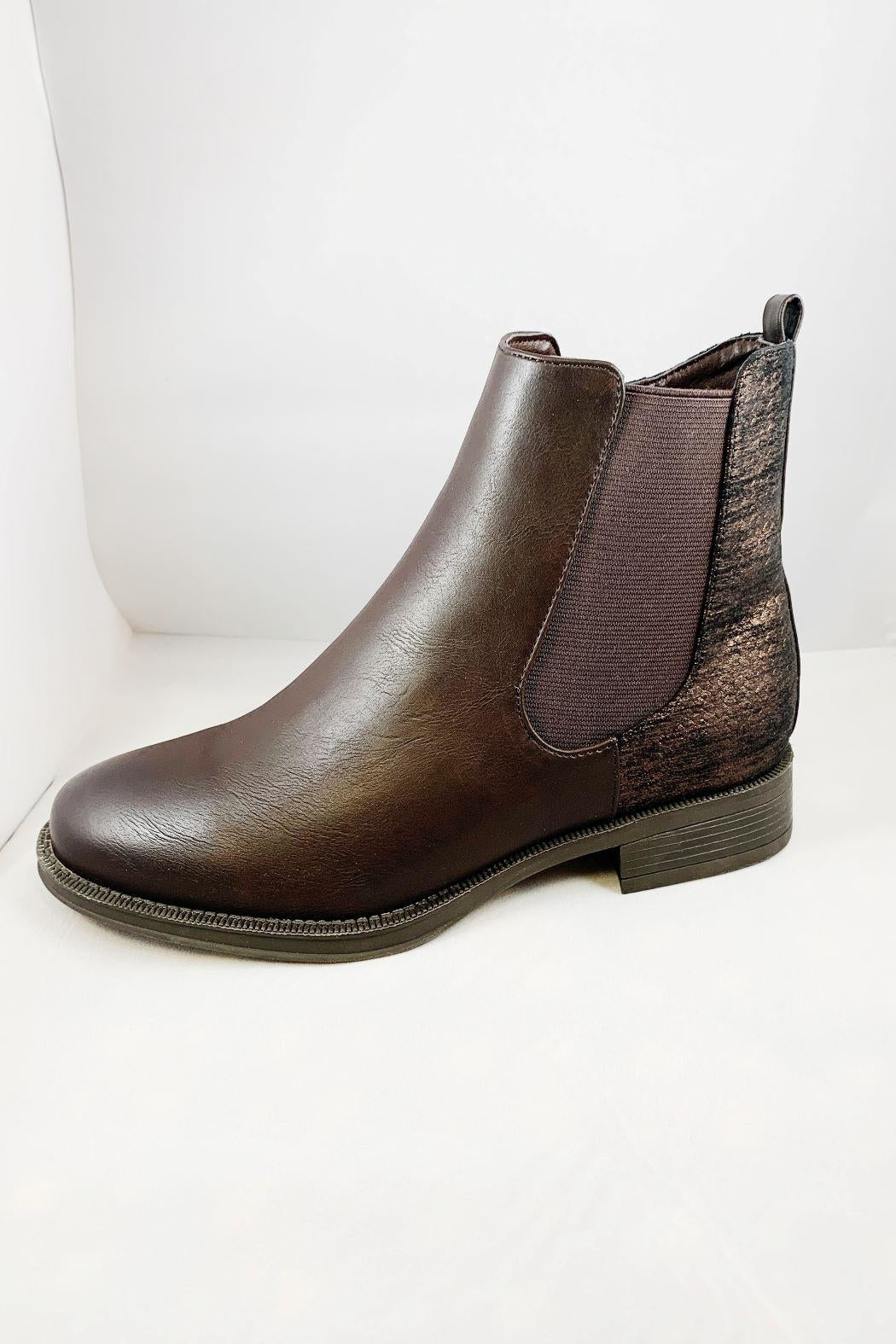 You will love wearing these adorable booties all year round. They are perfect for any outfit. The faux leather on the front of the boot and metallic fabric on the back is so cute. There is a zipper on the one side and elastic on the other side of it to make it easy to slip on. They have a small heel and will be comfortable all day.