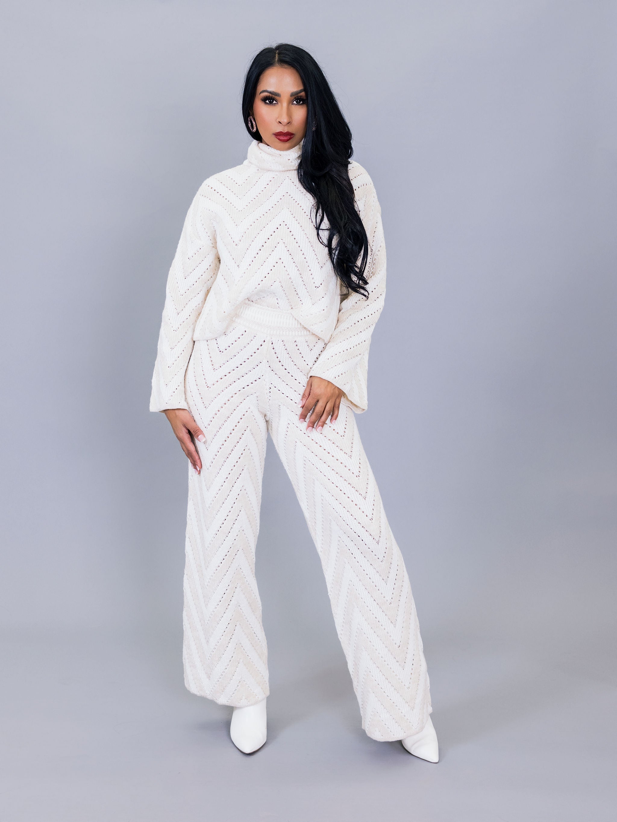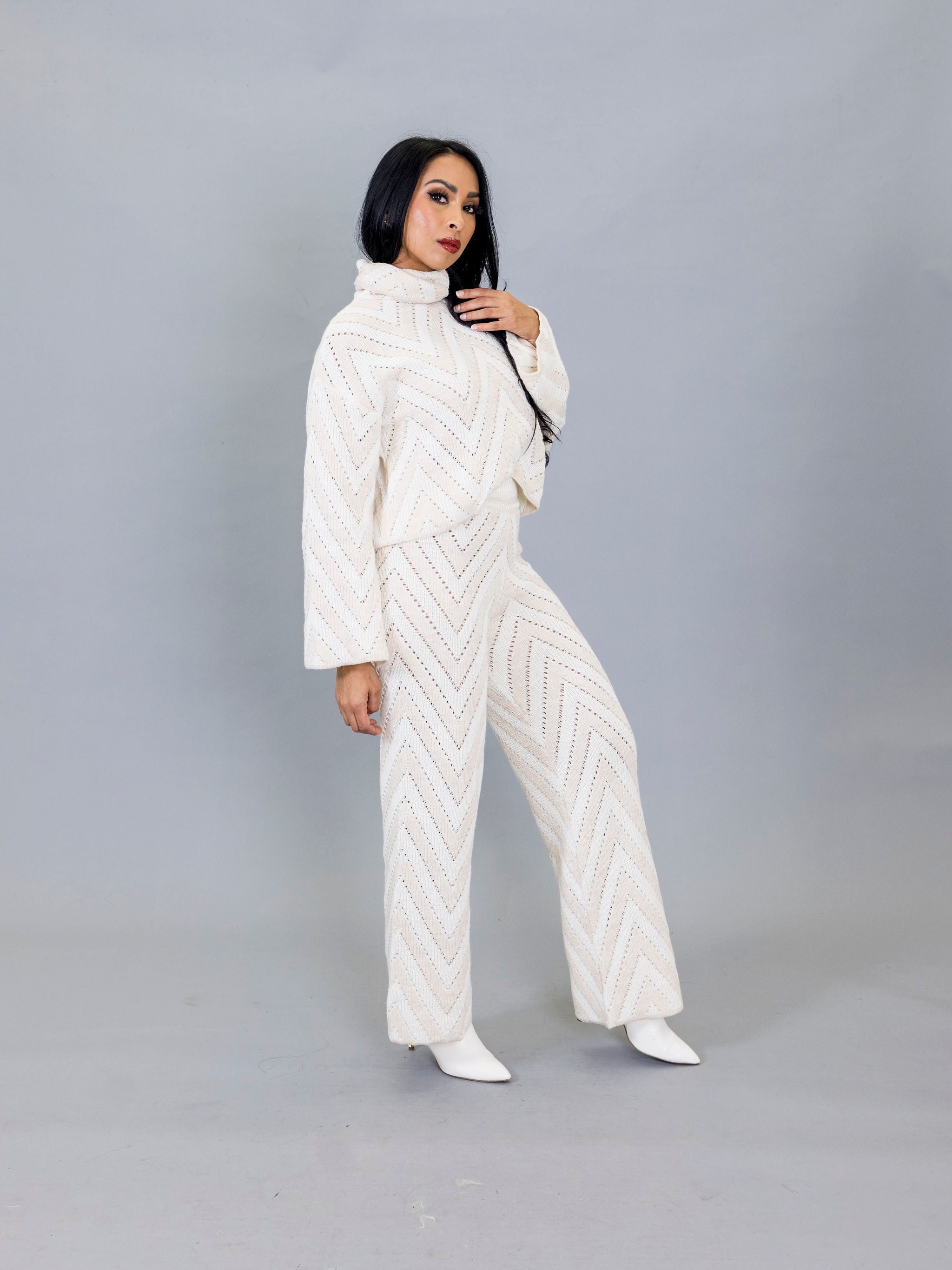 Lorna set features a luxe herringbone turtleneck sweater and coordinating straight leg pants. The long-sleeved top ties at the neck for a sophisticated look. For detailed measurements please refer to our size guide or email/call- momdchiccouture@gail.com/8329257491. You can also send a Dm on IG or FB