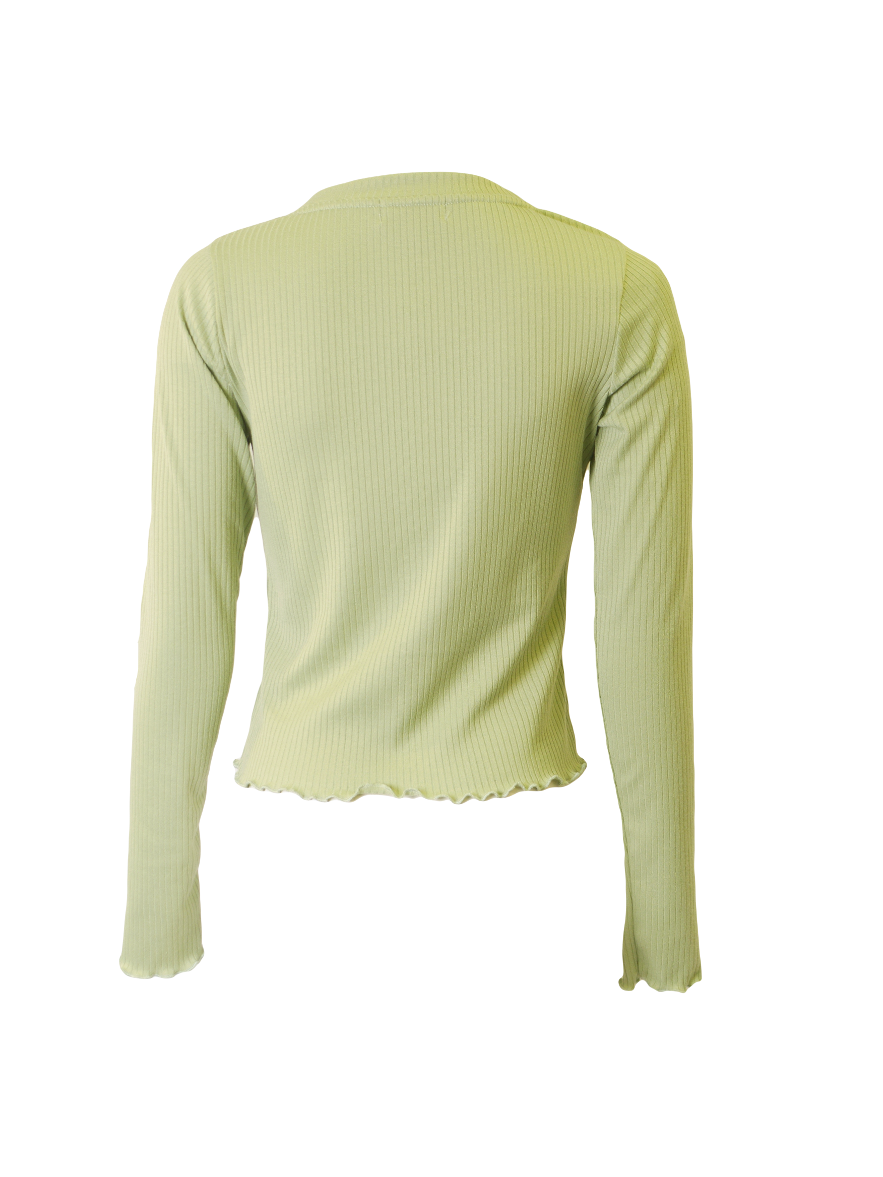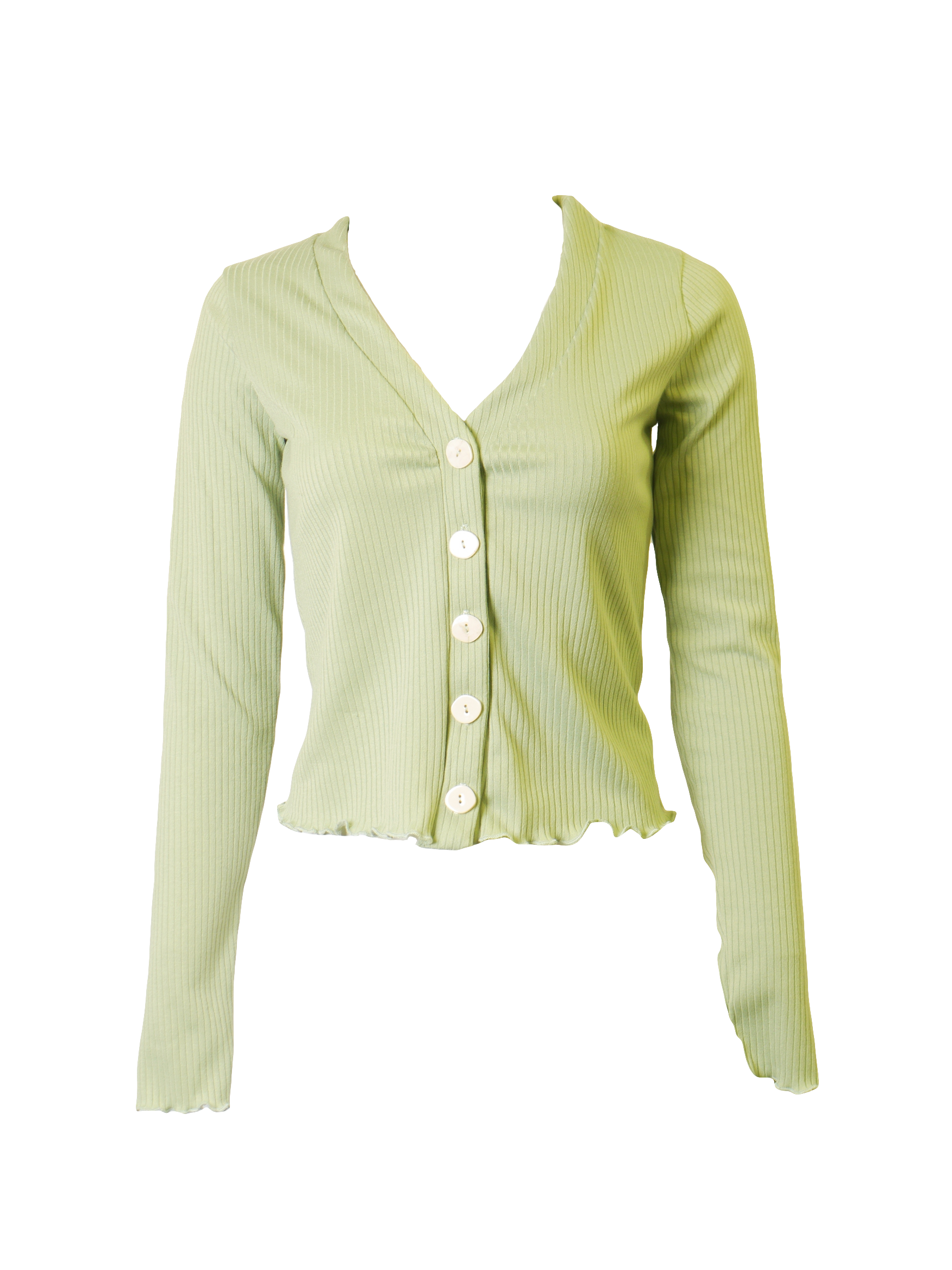 •LOOK: A nice, long-sleeved ribbed deep V-neck button-down cropped cardigan with stitched ruffle trim along with cuffs and hem. Comes in a soft sea green color.