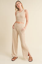 This lounge set features butter-soft material, making it irresistibly comfortable. The tank boasts a high neck design for added sophistication, while the pants offer the convenience of two side pockets. Upgrade your loungewear game with this must-have set.